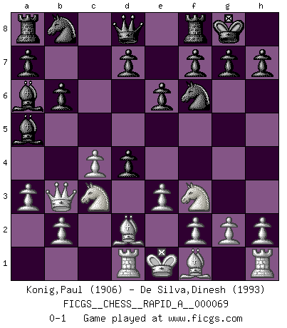 Last move : 0-1 2009 December 2 20:51:35 [Event "FICGS__CHESS__RAPID_A__000069"] [Site "FICGS"] [Date "2009.09.17"] [Round "1"] [White "Konig,Paul"] [Black "De Silva,Dinesh"] [Result "0-1"] [WhiteElo "1906"] [BlackElo "1993"] 1.d4 Nf6 2.c4 e6 3.Nc3 Bb4 4.Nf3 b6 5.Qb3 c5 6.a3 Ba5 7.e3 O-O 8.Bd2 Ba6 9.Rd1 cxd4 0-1 This chess game has been lost on time (started : 2009.09.17 4:21:6) Nimzo-Indian : Three knights variation Kingside Castling by player Black (move 7) Player Black won this chess game. Follow this game move after move (download)Chess is a fairy tale of 1001 blunders. (Savielly Tartakower) Schach ist Leben. (Robert James Fischer) Debemos de asegurarnos de que el Ajedrez no se convierta en un lenguaje muerto, muy interesante, pero tan solo para un grupo muy pequeño. (Sytze Faber) Mais n'est-ce pas déjà le limiter injurieusement que d'appeler les échecs un jeu? N'est-ce pas aussi une science, un art, ou quelque chose qui, comme le cercueil de Mahomet entre ciel et terre, est suspendu entre l'un et l'autre, et qui réunit un nombre incroyable de contraires ? (Stefan Zweig) But they are useless. They can only give you answers. (Pablo Picasso, about computers)
