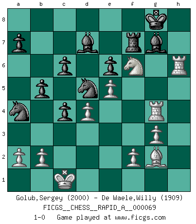 Last move : 1-0 2009 December 8 18:14:35 [Event "FICGS__CHESS__RAPID_A__000069"] [Site "FICGS"] [Date "2009.09.17"] [Round "1"] [White "Golub,Sergey"] [Black "De Waele,Willy"] [Result "1-0"] [WhiteElo "2000"] [BlackElo "1909"] 1.d4 d5 2.c4 c6 3.Nf3 Nf6 4.Nc3 e6 5.Bg5 dxc4 6.e4 b5 7.e5 h6 8.Bh4 g5 9.Nxg5 hxg5 10.Bxg5 Nbd7 11.g3 Rh5 12.h4 Rxg5 13.hxg5 Nd5 14.g6 fxg6 15.Qg4 Qe7 16.Qxg6+ Qf7 17.Qxf7+ Kxf7 18.Bg2 N7b6 19.Ne4 Kg8 20.O-O-O Bg7 21.Rh5 Bd7 22.Rdh1 Rf8 23.Rg5 Na4 24.Rh6 Rf5 25.Rg4 Rf7 26.Nf6+ 1-0 QGD Slav : 4.Nc3 Queenside Castling by player White (move 20) Player White won this chess game. Follow this game move after move (download)There must have been a time when men were demigods, or they could not have invented Chess. (Gustav Schenk) Der beste Spieler in einem Turnier gewinnt es nie. Er landet auf Platz zwei oder drei. (Siegbert Tarrasch) El Ajedrez, como cualquier actividad creativa, solo puede existir a través del esfuerzo combinado de aquellos que tienen talento creativo y de aquellos que poseen la habilidad de organizar su trabajo creativo. (Mikhail Botvinnik) Echiquier : carré parfait, comme la Jérusalem nouvelle décrite par l'auteur de l'Apocalypse, huit cases sur huit, exaltation du chiffre 4, symbole du cosmos aux quatre horizons... où le noir et le blanc, l'ombre et la lumière, le mal et le bien s'entremêlent et se conjuguent. (Robert Couffignal, Le Gambit du poète) Statistics can be made to prove anything - even the truth. (Author unknown)