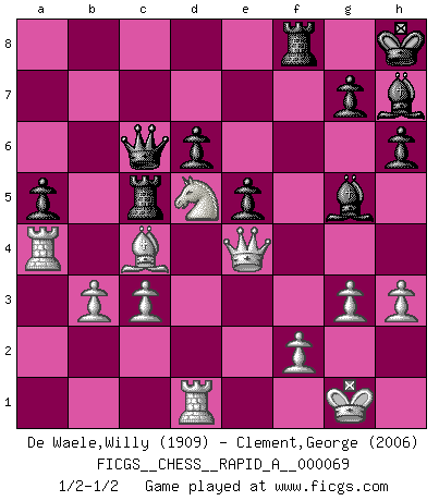 Last move : 1/2-1/2 2009 October 9 23:1:31 [Event "FICGS__CHESS__RAPID_A__000069"] [Site "FICGS"] [Date "2009.09.17"] [Round "1"] [White "De Waele,Willy"] [Black "Clement,George"] [Result "1/2-1/2"] [WhiteElo "1909"] [BlackElo "2006"] 1.e4 c5 2.Nf3 e6 3.d4 cxd4 4.Nxd4 Nf6 5.Nc3 Nc6 6.Ndb5 d6 7.Bf4 e5 8.Bg5 a6 9.Na3 b5 10.Nd5 Be7 11.Bxf6 Bxf6 12.c3 O-O 13.Nc2 Bg5 14.a4 bxa4 15.Rxa4 a5 16.Bc4 Rb8 17.b3 Kh8 18.Nce3 Ne7 19.Nxe7 Qxe7 20.Nd5 Qd8 21.O-O f5 22.exf5 Bxf5 23.Qe2 Bd7 24.Ra2 Be6 25.Rd1 Rc8 26.Ra4 Bd7 27.R4a1 Be6 28.Ra4 Bd7 29.Ra3 Be6 30.R3a1 Rc5 31.h3 Qb8 32.Ra2 Qb7 33.Qd3 Qc6 34.R2a1 Re8 35.Qe4 Rf8 36.Ra4 h6 37.Qd3 Bg8 38.g3 Bh7 39.Qe2 Bg8 40.Qe4 Bh7 1/2-1/2 Sicilian : Anderssen variation Kingside Castling by player Black (move 12) Kingside Castling by player White (move 21) This chess game ended in a draw. Follow this game move after move (download)The Chess pieces are the block alphabet which shapes thoughts; and these thoughts, although making a visual design on the chessboard, express their beauty abstractly, like a poem. (Marcel Duchamp) Er war ein guter Schachspieler, aber ich kann Leute nicht ausstehen, die 'Heil Hitler' rufen (Über Alexander Aljechin). (Miguel Najdorf) Nada excita más a Grandes Maestros aburridos que una novedad teórica. (Dominic Lawson) Pour se monter efficace, un Cavalier a besoin d'avant-postes ! Les Cavaliers font les meilleurs bloqueurs de pions passés. The human is the only animal species whose members are able to talk themselves into difficulties that would not otherwise exist. (Wendell Johnson)