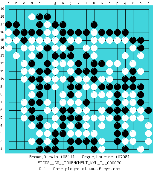 Last move : 0-1 2010 May 15 11:0:30 [Event "FICGS__GO__TOURNAMENT_KYU_I__000020"] [Site "FICGS"] [Date "2009.09.18"] [Round "1"] [Black "Bromo,Alexis"] [White "Segur,Laurine"] [Result "0-1"] [Rating 1 "0811"] [Rating 2 "0708"] 1.q16 d4 2.d16 q4 3.k4 m3 4.q10 f17 5.d10 d13 6.k16 c11 7.f14 e15 8.o6 r14 9.r15 q13 10.q12 q7 11.e5 c6 12.c15 d15 13.e16 c14 14.b14 b15 15.c16 b13 16.b16 a14 17.e17 a16 18.a17 a15 19.b17 f16 20.f18 f15 21.g17 d18 22.e18 g16 23.h17 h14 24.h16 p15 25.p16 q15 26.s14 s13 27.s15 n15 28.o16 o15 29.n16 m16 30.m17 l14 31.l13 o12 32.n12 m13 33.m12 m14 34.l16 m15 35.p7 o7 36.p8 q5 37.q6 r6 38.p6 q8 39.q9 r8 40.r9 p12 41.s8 r7 42.s7 s6 43.t6 s5 44.s9 o10 45.r4 r3 46.s4 t4 47.s3 r5 48.q3 r2 49.s2 q2 50.p3 s1 51.p4 t3 52.p2 t2 53.q1 n4 54.n5 m5 55.m6 o5 56.p5 n6 57.n7 n5 58.m7 o8 59.o9 n8 60.n9 m8 61.l8 m9 62.m10 l9 63.k9 l10 64.l11 k10 65.k7 l6 66.l7 k6 67.j6 j7 68.j8 k8 69.j9 h7 70.h6 g6 71.j5 g4 72.h4 f4 73.g3 j3 74.h3 k3 75.j2 f2 76.g2 f3 77.k2 l4 78.l2 l3 79.m2 n2 80.m1 j4 81.k5 g5 82.h5 l5 83.g1 g10 84.j10 j11 85.h11 h10 86.k11 j12 87.k12 n10 88.m11 n1 89.j1 s11 90.p9 o11 91.j13 h12 92.h13 g12 93.g13 j15 94.j16 k15 95.f12 g11 96.f11 f10 97.e10 d11 98.e11 d9 99.e9 d8 100.e8 h8 101.d7 c7 102.d6 c10 103.f1 q11 104.r11 r12 105.r10 f7 106.e7 f6 107.f9 g9 108.d5 c5 109.e4 d2 110.e2 e3 111.e1 g14 112.e13 e14 113.d12 c12 114.h15 g15 115.j14 d14 116.l7 k7 0-1 Here are the names of the openings (joseki) played in the four corners : Corner d16 : d16 f17 Hoshi (Hwajeom, Seongjeom, Xingwei`) 4-4 Point. The star or hoshi (4-4) point, emphasizing influence at the potential expense of territory. Ikken Kakari (Hankan Keolch'im, Yi Gua`jiao~, 1-Space Low Approach). White 2 is the standard approach move to the 4-4. Corner q16 : q16 r14 Hoshi (Hwajeom, Seongjeom, Xingwei`) 4-4 Point. The star or hoshi (4-4) point, emphasizing influence at the potential expense of territory. Ikken Kakari (Hankan Keolch'im, Yi Gua`jiao~, 1-Space Low Approach). White 2 is the standard approach move to the 4-4. Corner d4 : d4 e5 Hoshi (Hwajeom, Seongjeom, Xingwei`) 4-4 Point. The star or hoshi (4-4) point, emphasizing influence at the potential expense of territory. Player White won this Go (weiqi, baduk) game. Follow this game move after move (download)A basic: Don't push too hard. (Jansteen) Whatever you do, don't be bored. This is absolutely the most exciting time we could have possibly hoped to be alive. And things are just starting. (From movie Waking life)