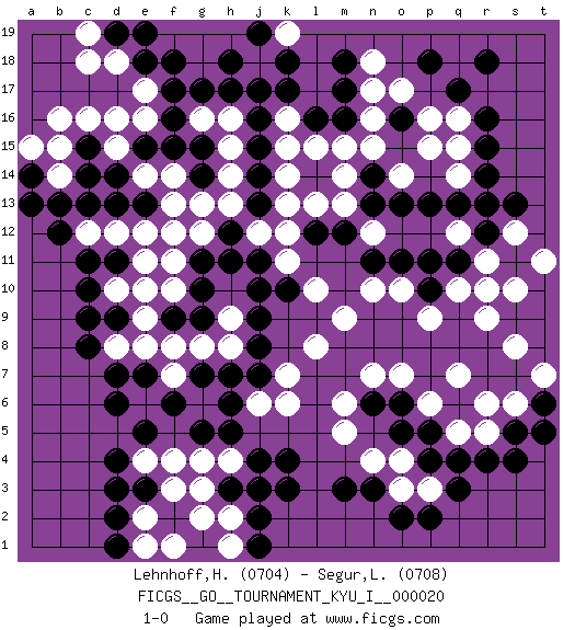Last move : 1-0 2010 May 25 18:30:11 [Event "FICGS__GO__TOURNAMENT_KYU_I__000020"] [Site "FICGS"] [Date "2009.09.18"] [Round "1"] [Black "Lehnhoff,Heinz-Georg"] [White "Segur,Laurine"] [Result "1-0"] [Rating 1 "0704"] [Rating 2 "0708"] 1.d4 q16 2.q4 d16 3.c14 b16 4.f17 e14 5.k4 r6 6.q6 q5 7.p5 r5 8.p4 p6 9.r4 q7 10.j16 g16 11.g17 f3 12.e3 f4 13.d6 e4 14.d3 e2 15.f16 h16 16.h17 j17 17.k17 j18 18.k18 k16 19.j15 k19 20.h18 e17 21.d2 j3 22.k3 m5 23.f6 h4 24.c11 b14 25.b13 b15 26.h6 g2 27.j2 f1 28.d1 e1 29.h3 h2 30.j4 g3 31.j3 h1 32.q11 r9 33.r14 r11 34.r12 q10 35.s11 r10 36.e18 f13 37.e15 d15 38.r16 q12 39.p11 s12 40.r13 s10 41.p13 m14 42.d9 e11 43.d14 e16 44.f15 d18 45.q17 q15 46.r15 p15 47.j13 h14 48.g14 h13 49.j14 g13 50.m12 l13 51.l12 o14 52.l16 k15 53.m17 n16 54.g11 f11 55.h12 l15 56.o13 k14 57.m16 m15 58.o16 n17 59.m18 o17 60.f9 d10 61.c10 d12 62.c13 g12 63.g10 e9 64.c9 e8 65.d7 f8 66.g9 g8 67.h7 h8 68.h11 j12 69.j8 h9 70.j11 k12 71.j9 k11 72.k10 f14 73.g15 h15 74.j19 k13 75.j17 f10 76.j10 e12 77.d13 c12 78.b12 d8 79.c8 e6 80.e7 f7 81.e5 n4 82.s13 t11 83.o5 n7 84.o6 o7 85.n6 m6 86.s5 s6 87.s4 m9 88.r18 o3 89.p2 p3 90.q3 n10 91.o2 l8 92.j1 n12 93.n13 m13 94.n11 o10 95.n14 n15 96.f18 k7 97.m3 j6 98.e13 n18 99.d19 c19 100.e19 c18 101.t6 t7 102.t5 s8 103.p18 p16 104.p10 p9 105.o11 l10 106.h5 g4 107.j7 k6 108.n3 o4 109.c15 c16 110.a14 a15 111.a13 f12 112.d11 g6 113.g5 e10 114.g7 q14 115.q13 1-0 Here are the names of the openings (joseki) played in the four corners : Corner d16 : d16 c14 Hoshi (Hwajeom, Seongjeom, Xingwei`) 4-4 Point. The star or hoshi (4-4) point, emphasizing influence at the potential expense of territory. Ikken Kakari (Hankan Keolch'im, Yi Gua`jiao~, 1-Space Low Approach). Black 2 is the standard approach move to the 4-4. Corner q4 : q4 r6 Hoshi (Hwajeom, Seongjeom, Xingwei`) 4-4 Point. The star or hoshi (4-4) point, emphasizing influence at the potential expense of territory. Ikken Kakari (Hankan Keolch'im, Yi Gua`jiao~, 1-Space Low Approach). White 2 is the standard approach move to the 4-4. Corner d4 : d4 f3 Hoshi (Hwajeom, Seongjeom, Xingwei`) 4-4 Point. The star or hoshi (4-4) point, emphasizing influence at the potential expense of territory. Ikken Kakari (Hankan Keolch'im, Yi Gua`jiao~, 1-Space Low Approach). White 2 is the standard approach move to the 4-4. Corner q16 : q16 q11 Hoshi (Hwajeom, Seongjeom, Xingwei`) 4-4 Point. The star or hoshi (4-4) point, emphasizing influence at the potential expense of territory. Player Black won this Go (weiqi, baduk) game. Follow this game move after move (download)Fighting must not be the key to go, it should be reserved as your last resource. (Zhong-Pu Liu, about Weiqi) A good teacher is like a candle - it consumes itself to light the way for others. (Author unknown)
