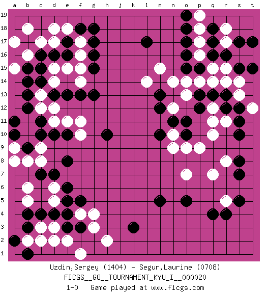 Last move : 1-0 2009 November 10 12:54:45 [Event "FICGS__GO__TOURNAMENT_KYU_I__000020"] [Site "FICGS"] [Date "2009.09.18"] [Round "1"] [Black "Uzdin,Sergey"] [White "Segur,Laurine"] [Result "1-0"] [Rating 1 "1404"] [Rating 2 "0708"] 1.r16 d5 2.q4 e15 3.d16 q7 4.m5 r5 5.r4 q10 6.e16 d15 7.c15 c17 8.c16 d14 9.c14 d17 10.e17 e18 11.d13 f15 12.b17 b18 13.f18 d18 14.e13 b16 15.b15 a17 16.g15 f16 17.g16 f17 18.g18 f14 19.g13 c13 20.b13 c12 21.b12 d12 22.f13 a15 23.b14 b11 24.g17 c8 25.c11 d11 26.c10 b10 27.d10 e11 28.b9 c9 29.a10 b8 30.a11 a8 31.e10 f11 32.e3 g3 33.c4 d3 34.d4 c3 35.e5 f4 36.e4 e2 37.b3 b2 38.a2 d2 39.b4 f1 40.e8 a9 41.h10 f10 42.f5 d6 43.k3 h2 44.f3 g4 45.r12 r14 46.p15 a1 47.b1 c2 48.s10 r11 49.s11 q12 50.r13 s14 51.s7 t12 52.q13 q14 53.p13 q15 54.q16 s16 55.s17 r17 56.s15 t16 57.t15 p16 58.q17 r18 59.q18 p14 60.o15 o14 61.o16 p17 62.o17 p18 63.o18 p19 64.o19 r15 65.t17 o13 66.p12 q11 67.o5 s13 68.s12 n12 69.o10 r8 70.s8 p9 71.s5 o7 72.m10 n10 73.n11 n9 74.o11 o9 75.m12 n14 76.m13 m15 77.l17 l14 78.e6 b6 79.d7 b5 80.c7 1-0 Here are the names of the openings (joseki) played in the four corners : Corner d16 : e15 d16 Go-no-go (Wu~wu~) 5-5 Point. The 5-5 was experimented with briefly during the "New Fuseki" movement in Japan in the 1930s. The 5-5 point has not retained popularity because the 4-4 hoshi (star) point strikes a better balance between influence and territory. As one can see from the variations, though, the 5-5 is playable. Corner q4 : q4 q7 Hoshi (Hwajeom, Seongjeom, Xingwei`) 4-4 Point. The star or hoshi (4-4) point, emphasizing influence at the potential expense of territory. Nikken Takagakari (Dukan Nop'dakeolch'im, E`r Gaojia, 2-Space High Approach). White 2 is a light approach move. Rarely played in even games, White 2 is typically employed in handicap games. Black continues with 6-4 or 3-10. In Korean Sunjang Baduk Black has a stone on 8-4. Player Black won this Go (weiqi, baduk) game. Follow this game move after move (download)If White takes all four corners, Black should resign; if Black takes all four corners, Black should also resign. (David Kent) The only thing that matters is the evidence. (Horatio Caine, C.S.I. Miami)