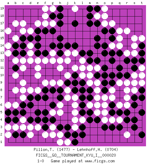 Last move : 1-0 2010 February 1 0:59:54 [Event "FICGS__GO__TOURNAMENT_KYU_I__000020"] [Site "FICGS"] [Date "2009.09.18"] [Round "1"] [Black "Pillon,Thibault"] [White "Lehnhoff,Heinz-Georg"] [Result "1-0"] [Rating 1 "1477"] [Rating 2 "0704"] 1.p3 d16 2.c5 q16 3.c14 f17 4.r14 q14 5.q13 p14 6.r15 r16 7.r10 c11 8.b16 o12 9.k17 r13 10.r12 s13 11.q11 c17 12.e14 b17 13.d11 q15 14.c10 d3 15.e4 e3 16.f4 g2 17.h3 h2 18.j3 b3 19.n17 c7 20.d7 r7 21.s12 s15 22.r4 o10 23.p9 s5 24.r5 o4 25.o3 r6 26.p6 n6 27.n4 n8 28.h17 l4 29.l3 b15 30.b14 a16 31.m5 m6 32.l5 d8 33.e7 p8 34.q8 p7 35.q7 q6 36.p5 q9 37.p10 k7 38.p13 n11 39.o13 n13 40.o14 o15 41.n14 o17 42.n15 k4 43.m4 k3 44.l2 k5 45.e9 e8 46.f8 g3 47.g4 c8 48.c6 n18 49.m17 e12 50.d12 b10 51.b11 f7 52.g8 f6 53.e5 e6 54.d6 g7 55.h7 k19 56.m13 l11 57.h13 h11 58.g18 h6 59.g6 g5 60.f5 h5 61.g6 b6 62.b5 a6 63.a5 j10 64.g16 f18 65.l6 k13 66.k12 l12 67.l13 j12 68.k14 j13 69.j14 g12 70.j2 k6 71.l7 l8 72.m7 n7 73.m8 s9 74.k8 j8 75.l9 j7 76.k10 k11 77.j9 h9 78.h8 k9 79.f3 f2 80.j9 f9 81.d9 k9 82.c2 c3 83.j9 g9 84.f7 k9 85.b2 d2 86.j9 a2 87.k9 e10 88.d10 e11 89.m18 o18 90.m19 t3 91.s4 t4 92.s3 t6 93.t2 h14 94.g14 g19 95.h19 f19 96.f16 a14 97.b13 d13 98.e13 c12 99.c13 c9 100.o16 d14 101.d15 d12 102.c15 b8 103.q5 g13 104.h15 c16 105.e16 e17 106.p16 p17 107.n12 b12 108.o9 n9 109.n19 o19 110.t13 s14 111.t5 r9 112.s6 l10 113.s7 r8 114.p15 m9 115.l8 o5 116.p12 g17 117.h18 j1 118.k2 a13 119.e15 t11 120.o11 p4 121.n10 m11 122.t12 s10 123.s11 q4 124.q3 t10 125.k1 h1 126.f13 f12 127.t14 t15 128.d4 o6 129.o8 o7 130.a4 a3 131.q10 s8 132.t8 r2 133.m12 h12 134.h14 c4 135.b4 m10 136.o10 n5 137.t7 t9 138.pass 1-0 Here are the names of the openings (joseki) played in the four corners : Corner d16 : d16 c14 Hoshi (Hwajeom, Seongjeom, Xingwei`) 4-4 Point. The star or hoshi (4-4) point, emphasizing influence at the potential expense of territory. Ikken Kakari (Hankan Keolch'im, Yi Gua`jiao~, 1-Space Low Approach). Black 2 is the standard approach move to the 4-4. Corner q16 : q16 r14 Hoshi (Hwajeom, Seongjeom, Xingwei`) 4-4 Point. The star or hoshi (4-4) point, emphasizing influence at the potential expense of territory. Ikken Kakari (Hankan Keolch'im, Yi Gua`jiao~, 1-Space Low Approach). Black 2 is the standard approach move to the 4-4. Corner d4 : c5 d3 Mokuhazushi (Waemok, Wai`mu`) 5-3 Point. The mokuhazushi (5-3) point was popular in the Edo period in Japan (1600 - 1867). It emphasizes influence; territorially, it is inferior to the 3-4 point. Komoku Kakari. White 2 is the standard approach because of its solidity and stability. Corner q4 : p3 r7 Mokuhazushi (Waemok, Wai`mu`) 5-3 Point. The mokuhazushi (5-3) point was popular in the Edo period in Japan (1600 - 1867). It emphasizes influence; territorially, it is inferior to the 3-4 point. Player Black won this Go (weiqi, baduk) game. Follow this game move after move (download)When you study joseki, you lose two stones in strength. (Anonymous) I just play for fun. (Anna Kournikova)