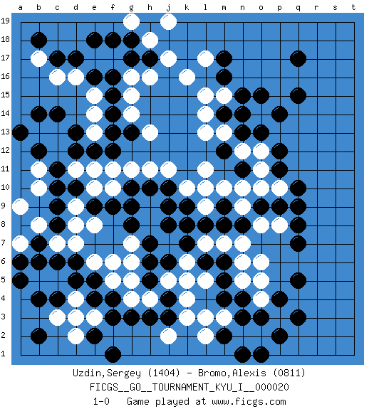 Last move : 1-0 2010 January 30 12:40:36 [Event "FICGS__GO__TOURNAMENT_KYU_I__000020"] [Site "FICGS"] [Date "2009.09.18"] [Round "1"] [Black "Uzdin,Sergey"] [White "Bromo,Alexis"] [Result "1-0"] [Rating 1 "1404"] [Rating 2 "0811"] 1.q17 d4 2.q3 d16 3.q15 k4 4.q5 k16 5.d10 k10 6.q10 o6 7.q7 o14 8.d6 c5 9.c6 e6 10.f3 e3 11.f4 f5 12.j3 g4 13.g3 h4 14.h3 k3 15.e2 d2 16.f1 j2 17.j4 j5 18.e4 d3 19.e5 f6 20.d5 d7 21.c4 b5 22.b4 b6 23.b7 a7 24.a8 c7 25.a6 b8 26.a5 c3 27.b2 a9 28.c8 a7 29.b6 d8 30.c9 d9 31.c10 e10 32.c14 d11 33.c11 c12 34.e9 e8 35.f9 f10 36.g9 h9 37.g10 e11 38.b12 b10 39.d12 c13 40.d13 b13 41.b14 b11 42.a13 g11 43.h10 h11 44.j9 h8 45.j10 j11 46.k9 l9 47.k7 k6 48.l8 l11 49.m9 l10 50.l6 l5 51.h5 g5 52.h6 j7 53.j6 k5 54.h7 g7 55.j8 m7 56.m6 n6 57.m5 n5 58.m4 g6 59.g8 n7 60.m8 l7 61.n4 o4 62.m2 m3 63.n3 l3 64.o3 p3 65.p4 o5 66.h17 n10 67.o9 n9 68.n8 o8 69.m17 l17 70.m16 o2 71.p2 n2 72.n1 m10 73.k8 l2 74.o1 e13 75.c17 c16 76.d17 e17 77.e16 e15 78.f16 f17 79.g17 g16 80.f15 g15 81.f14 e14 82.g13 g14 83.f13 h13 84.f18 j17 85.e12 f11 86.f12 b17 87.b18 h16 88.m14 m15 89.n15 l15 90.o15 n14 91.p14 h18 92.g18 j19 93.n13 m13 94.o13 l14 95.n14 n12 96.m12 l13 97.n11 o10 98.p9 p8 99.q8 p10 100.q9 o12 101.p12 o11 102.p11 g19 103.e18 1-0 Here are the names of the openings (joseki) played in the four corners : Corner d4 : d4 d6 Hoshi (Hwajeom, Seongjeom, Xingwei`) 4-4 Point. The star or hoshi (4-4) point, emphasizing influence at the potential expense of territory. Ikken Takagakari (Hankan Nop'dakeolch'im, Yi Gaojia, 1-Space High Approach). White typically responds at 6-4 or 3-10. White 4-10 is played when White finds play on the right side advantageous. White 4-8 or 3-8 may be played when White has support at top. Corner d16 : d16 c14 Hoshi (Hwajeom, Seongjeom, Xingwei`) 4-4 Point. The star or hoshi (4-4) point, emphasizing influence at the potential expense of territory. Ikken Kakari (Hankan Keolch'im, Yi Gua`jiao~, 1-Space Low Approach). Black 2 is the standard approach move to the 4-4. Player Black won this Go (weiqi, baduk) game. Follow this game move after move (download)For rectangular six in the corner, dame is necessary. (Anonymous) Without enthusiasm, virtue functions not at all, and vice only poorly. (Mignon McLaughlin, The Neurotic's Notebook, 1960)