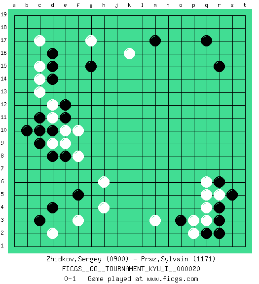 Last move : 0-1 2009 December 1 9:10:52 [Event "FICGS__GO__TOURNAMENT_KYU_I__000020"] [Site "FICGS"] [Date "2009.09.18"] [Round "1"] [Black "Zhidkov,Sergey"] [White "Praz,Sylvain"] [Result "0-1"] [Rating 1 "0900"] [Rating 2 "1171"] 1.q17 q4 2.d4 c17 3.r15 k16 4.c11 c13 5.e11 f3 6.f5 d2 7.c3 h4 8.o3 m3 9.r6 q6 10.r3 q3 11.r4 r5 12.q2 p2 13.r2 p3 14.s5 q5 15.m17 h6 16.d14 c14 17.d15 c15 18.d16 d12 19.e12 d11 20.d10 c10 21.c9 e10 22.b10 d9 23.d8 c10 24.e8 f10 25.d10 e9 26.c10 f8 27.g15 g17 0-1 This go game has been lost on time (started : 2009.09.18 9:21:20) Here are the names of the openings (joseki) played in the four corners : Corner d16 : c17 c11 San-San (Sam-Sam, San-San) 3-3 Point. The San-San (3-3) point, emphasizing territory at the expense of influence. Corner d4 : d4 f3 Hoshi (Hwajeom, Seongjeom, Xingwei`) 4-4 Point. The star or hoshi (4-4) point, emphasizing influence at the potential expense of territory. Ikken Kakari (Hankan Keolch'im, Yi Gua`jiao~, 1-Space Low Approach). White 2 is the standard approach move to the 4-4. Corner q4 : q4 o3 Hoshi (Hwajeom, Seongjeom, Xingwei`) 4-4 Point. The star or hoshi (4-4) point, emphasizing influence at the potential expense of territory. Ikken Kakari (Hankan Keolch'im, Yi Gua`jiao~, 1-Space Low Approach). Black 2 is the standard approach move to the 4-4. Player White won this Go (weiqi, baduk) game. Follow this game move after move (download)Learning josekis by heart is useless if you don't try departing from them. (Pierre Audouard) That's absurd. I love it. (Gregory House, House M.D.)