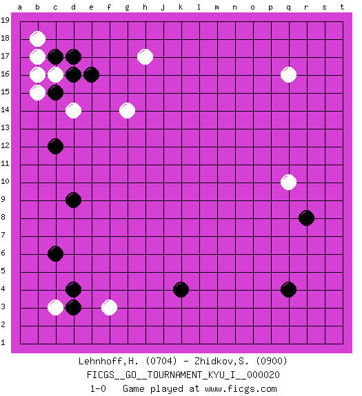 Last move : 1-0 2009 November 30 9:1:35 [Event "FICGS__GO__TOURNAMENT_KYU_I__000020"] [Site "FICGS"] [Date "2009.09.18"] [Round "1"] [Black "Lehnhoff,Heinz-Georg"] [White "Zhidkov,Sergey"] [Result "1-0"] [Rating 1 "0704"] [Rating 2 "0900"] 1.d4 q16 2.q4 c16 3.e16 d14 4.c17 b17 5.d17 b18 6.k4 h17 7.c12 g14 8.c15 b15 9.d9 q10 10.d16 b16 11.r8 f3 12.c6 c3 13.d3 1-0 This go game has been lost on time (started : 2009.09.18 9:21:20) Here are the names of the openings (joseki) played in the four corners : Corner d16 : c16 e16 Komoku (Somok, Xiao~mu`) 3-4 Point. The komoku (3-4) point is the traditional corner enclosure move.. Ikken Takagakari (Hankan Nop'dakeolch'im, Yi Gaogua`jiao~, 1-Space High Approach). The 5-4 approach move has become more popular in modern times, as modern Go emphasizes speed and influence. Player Black won this Go (weiqi, baduk) game. Follow this game move after move (download)Don't disturb symmetry. (Anonymous) Patience, use the Force, think ! (Obi-Wan Kenobi in Star Wars ep.2)