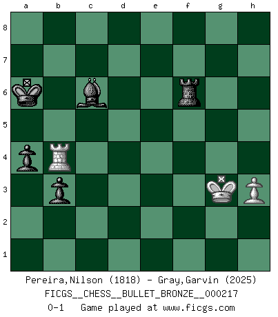 Last move : 0-1 2009 September 18 18:39:36 [Event "FICGS__CHESS__BULLET_BRONZE__000217"] [Site "FICGS"] [Date "2009.09.18"] [Round "1"] [White "Pereira,Nilson"] [Black "Gray,Garvin"] [Result "0-1"] [WhiteElo "1818"] [BlackElo "2025"] 1.e4 e6 2.d4 d5 3.Nc3 Bb4 4.e5 c5 5.a3 Bxc3+ 6.bxc3 Ne7 7.Qg4 Qc7 8.Qxg7 Rg8 9.Qxh7 cxd4 10.Ne2 Nbc6 11.f4 Bd7 12.Bb2 dxc3 13.Nxc3 Nd4 14.Nxd5 Nxc2+ 15.Kd1 exd5 16.Qxc2 Bg4+ 17.Kc1 Qb6 18.Qa4+ Bd7 19.Qd4 Qb3 20.Kd2 Nf5 21.Qc3 Qb6 22.Ke1 d4 23.Qd2 d3 24.Bc3 Bc6 25.Ra2 Qb1+ 26.Kf2 Qb5 27.Rb2 Qc5+ 28.Ke1 O-O-O 29.Bxd3 Ne3 30.Bb4 Qd4 31.g3 Qxd3 32.Qxd3 Rxd3 33.Ke2 Nc4 34.Rc2 Re3+ 35.Kf2 Rf3+ 36.Ke2 b5 37.Rhc1 Rh8 38.Ke1 Kb7 39.Re2 a5 40.Be7 Nxa3 41.e6 fxe6 42.Rxe6 Nc4 43.Bh4 Re3+ 44.Rxe3 Nxe3 45.Kf2 Nf5 46.Rc5 Nxh4 47.gxh4 Rxh4 48.Kg3 Rh7 49.f5 a4 50.Rc3 b4 51.Rc4 b3 52.f6 Rf7 53.Rb4+ Ka6 54.h3 Rxf6 0-1 French : Winawer, Advance, poisoned pawn variation Queenside Castling by player Black (move 28) 10 pieces endgame at move 47 : White KRPPP , Black KRBPP WHITE : King + 1 Rook 3 Pawns BLACK : King + 1 Rook 1 Bishop 2 Pawns 9 pieces endgame at move 47 : White KRPP , Black KRBPP WHITE : King + 1 Rook 2 Pawns BLACK : King + 1 Rook 1 Bishop 2 Pawns 8 pieces endgame at move 54 : White KRP , Black KRBPP WHITE : King + 1 Rook 1 Pawn BLACK : King + 1 Rook 1 Bishop 2 Pawns Player Black won this chess game. Follow this game move after move (download)Chess is the art which expresses the science of logic. (Mikhail Botvinnik) Ich spiele ehrlich und spiele, um zu gewinnen. Wenn ich verliere nehme ich meine Medizin. (Robert James Fischer) Un Peón pasado es un criminal, quién debe ser mantenido bajo candado y llave. Leves medidas, tales como vigilancia policiaca, no son suficientes. (Aaron Nimzovich) Nous sommes les pions de la mystérieuse partie d'Echecs jouée par Dieu. Il nous déplace, nous arrête, nous pousse encore, puis nous lance un à un dans la boîte du Néant. Epitaphe sur la tombe de David Janowsky (1868-1927). Hello Thibault, if I have had a plan (and I had one, I hope), I have forgotten it during the last week... - Hello Heinz-Georg. What do you mean a plan ? (Anonymous players, during a Big Chess game)