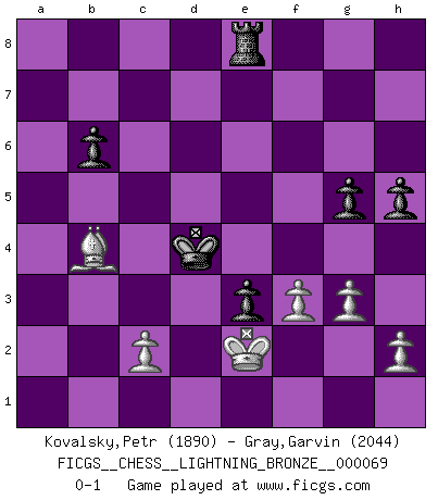 Last move : 0-1 2009 September 19 20:36:15 [Event "FICGS__CHESS__LIGHTNING_BRONZE__000069"] [Site "FICGS"] [Date "2009.09.19"] [Round "1"] [White "Kovalsky,Petr"] [Black "Gray,Garvin"] [Result "0-1"] [WhiteElo "1890"] [BlackElo "2044"] 1.e4 e6 2.d4 d5 3.Nc3 Bb4 4.exd5 exd5 5.Bd3 Nc6 6.a3 Bxc3+ 7.bxc3 Nge7 8.Qh5 Be6 9.Rb1 b6 10.Nf3 Qd7 11.Ng5 O-O-O 12.O-O h6 13.Nxe6 fxe6 14.Re1 Rhf8 15.Qe2 Rf6 16.a4 Nf5 17.a5 Nxa5 18.Bxf5 Rxf5 19.Qa6+ Nb7 20.Ba3 Qc6 21.Qxa7 Na5 22.Qa6+ Kd7 23.Qe2 Nc4 24.Bb4 e5 25.Ra1 e4 26.Ra7 h5 27.Rea1 Qh6 28.Rd1 e3 29.f3 g5 30.Rf1 Qf6 31.R7a1 Kc6 32.g3 Re8 33.Ra7 Nd2 34.Qa6 Kd7 35.c4 Nxf1 36.Rxc7+ Kxc7 37.Qa7+ Kc8 38.Qa8+ Kd7 39.Qb7+ Ke6 40.cxd5+ Rxd5 41.Qc6+ Kf7 42.Qxd5+ Qe6 43.Qxe6+ Kxe6 44.Kxf1 Kd5 45.Ke2 Kxd4 0-1 French : Winawer (Nimzovich) variation Queenside Castling by player Black (move 11) Kingside Castling by player White (move 12) Player Black won this chess game. Follow this game move after move (download)If I win a tournament, I win it by myself. I do the playing. Nobody helps me. (Bobby Fischer) Wenn ich einen Club besuche, sind die Spieler stumm vor Staunen. (José Raúl Capablanca) Cuando le juegas a Fischer, no es una cuestion de si vas a ganar o perder. Es una cuestion de si vas a sobrevivir. (Boris Spassky) Il vaut mieux sacrifier les pièces de l'adversaire. (Xavier Tartacover) CHESS, n. f. [echecs, Fr.] A nice and abstruse game, in which two sets of puppets are moved in opposition to each other. (Dr Samuel Johnson, A Dictionary Of The English Language, 1755)