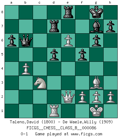 Last move : 0-1 2010 March 5 21:38:21 [Event "FICGS__CHESS__CLASS_B__000086"] [Site "FICGS"] [Date "2009.09.20"] [Round "1"] [White "Taleno,David"] [Black "De Waele,Willy"] [Result "0-1"] [WhiteElo "1800"] [BlackElo "1909"] 1.d4 d5 2.c4 c6 3.Nc3 Nf6 4.cxd5 cxd5 5.Bg5 Ne4 6.Nxe4 dxe4 7.Rc1 Be6 8.Qa4+ Nc6 9.e3 a6 10.Bf4 b5 11.Qd1 Nb4 12.a3 Nd5 13.Be5 f6 14.Bg3 g6 15.Ne2 Bh6 16.Nc3 Qa5 17.Rc2 Rc8 18.Qc1 b4 19.axb4 Nxb4 20.Rd2 Nd5 21.Rc2 O-O 22.Be2 Nb4 23.Rd2 Nd3+ 24.Bxd3 exd3 25.Rxd3 Bd5 26.O-O Bc4 27.Rd2 Bxf1 28.Qxf1 Rfd8 29.Rd1 Bg7 30.Qe2 Rd7 31.e4 f5 32.e5 e6 33.d5 exd5 34.e6 Re8 35.b4 Qb6 0-1 QGD Slav defense Kingside Castling by player Black (move 21) Kingside Castling by player White (move 26) Player Black won this chess game. Follow this game move after move (download)Openings teach you openings. Endgames teach you chess ! (Stephan Gerzadowicz) Ein Großmeister muß tausende Partien in seinem Kopf speichern, denn diese sind für Ihn, was die Worte der Muttersprache für gewöhnliche Leute sind, oder Noten für Musiker... (Garry Kasparov) El Ajedrez es un expediente tonto que hace creer a la gente inactiva que hacen una cosa muy astuta cuando solamente estan perdiendo su tiempo. (George Bernard Shaw) Shah mat. Le roi est mort. Cri de fierté d'un joueur venant de terrasser son adversaire, courtoisement, sans effusion de sang. You must do what you feel is right... of course. (Obi-Wan Kenobi in Star Wars ep.4)