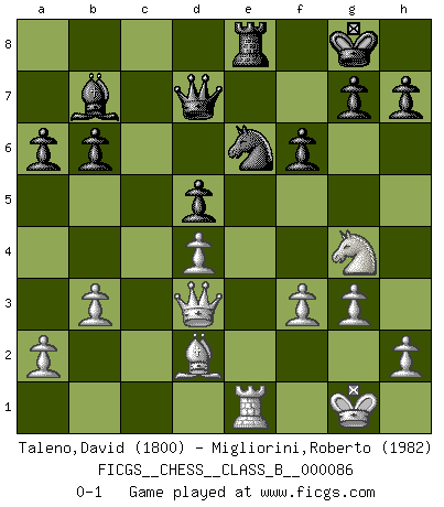 Last move : 0-1 2010 March 6 9:37:53 [Event "FICGS__CHESS__CLASS_B__000086"] [Site "FICGS"] [Date "2009.09.20"] [Round "1"] [White "Taleno,David"] [Black "Migliorini,Roberto"] [Result "0-1"] [WhiteElo "1800"] [BlackElo "1982"] 1.d4 Nf6 2.Nf3 e6 3.e3 b6 4.c4 Bb7 5.Bd3 Be7 6.Nc3 d5 7.cxd5 exd5 8.O-O O-O 9.Ne5 Re8 10.Qc2 Bd6 11.Nb5 c5 12.Nxd6 Qxd6 13.b3 cxd4 14.exd4 Nc6 15.Bb2 Nb4 16.Qe2 Nxd3 17.Qxd3 Ne4 18.f3 Ng5 19.Rfe1 f6 20.Ng4 Ne6 21.g3 Rac8 22.Rac1 Rxc1 23.Bxc1 Qd7 24.Bd2 a6 0-1 Queen's pawn : Yusupov-Rubinstein system Kingside Castling by player White (move 8) Kingside Castling by player Black (move 8) Player Black won this chess game. Follow this game move after move (download)Not all artists are Chess players, but all Chess players are artists. (Marcel Duchamp) Ich rechne überhaupt nicht voraus. Ich gewinne auch so. (Robert James Fischer) Ciertamente, de todas la drogas del mundo, el Ajedrez debe ser el mas placentero permamentemente. (Assiac) Aidez vos pièces, elles vous aideront. (Paul Morphy) I've never seen so many men wasted so badly. (Blondie in The Good, The Bad and The Ugly)