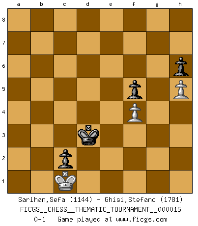 Last move : 0-1 2006 December 13 16:46:19 [Event "FICGS__CHESS__THEMATIC_TOURNAMENT__000015"] [Site "FICGS"] [Date "2006.09.26"] [Round "1"] [White "Sarihan,Sefa"] [Black "Ghisi,Stefano"] [Result "0-1"] [WhiteElo "1144"] [BlackElo "1781"] 1.e4 e5 2.Nf3 Nc6 3.Bc4 Nf6 4.Ng5 Bc5 5.d3 O-O 6.O-O d5 7.exd5 Bg4 8.Nf3 Nd4 9.Nbd2 b5 10.Bb3 a5 11.a4 Bxf3 12.Nxf3 Nxb3 13.cxb3 Qxd5 14.axb5 Rfb8 15.Qc2 Rxb5 16.Bg5 Qxb3 17.Qxb3 Rxb3 18.Nxe5 Rxb2 19.Bxf6 gxf6 20.Nc4 Rb5 21.Ra2 a4 22.Rd1 Bd4 23.g3 c5 24.Kg2 Kg7 25.f4 Rb3 26.Kf3 Kg6 27.g4 f5 28.gxf5+ Kxf5 29.Nd6+ Ke6 30.Nc4 a3 31.Re1+ Kd5 32.Ne3+ Bxe3 33.Kxe3 Re8 34.Kd2 Rxe1 35.Kxe1 f5 36.Kd2 Rb2 37.Rxb2 axb2 38.Kc2 Kd4 39.Kxb2 Kxd3 40.Kc1 c4 41.h3 c3 42.h4 h6 43.h5 c2 0-1 Two knights defense : Wilkes Barre (Traxler) variation Kingside Castling by player Black (move 5) Kingside Castling by player White (move 6) 10 pieces endgame at move 37 : White KRPPP , Black KPPPP WHITE : King + 1 Rook 3 Pawns BLACK : King + 4 Pawns 9 pieces endgame at move 37 : White KPPP , Black KPPPP WHITE : King + 3 Pawns BLACK : King + 4 Pawns 8 pieces endgame at move 39 : White KPPP , Black KPPP WHITE : King + 3 Pawns BLACK : King + 3 Pawns 7 pieces endgame at move 39 : White KPP , Black KPPP WHITE : King + 2 Pawns BLACK : King + 3 Pawns Player Black won this chess game. Follow this game move after move (download)Combinations have always been the most intriguing aspect of Chess. The masters look for them, the public applauds them, the critics praise them. It is because combinations are possible that Chess is more than a lifeless mathematical exercise. They are the poetry of the game; they are to Chess what melody is to music. They represent the triumph of mind over matter. (Reuben Fine) Sie führen leise Selbstgespräche, schlürfen lautstark ihre Getränke, schmatzen hörbar beim Essen, blasen ihrem Gegenüber Rauch in die Augen, niesen ihm ins Gesicht, starren ihn unverwandt an, bis er sich unter ihren Blicken windet, rutschen ständig auf ihrem Stuhl hin und her, rülpsen und bohren in der Nase. (Anonymous) El arma más poderosa en el Ajedrez, es tener la próxima movida. (David Bronstein) Mais n'est-ce pas déjà le limiter injurieusement que d'appeler les échecs un jeu? N'est-ce pas aussi une science, un art, ou quelque chose qui, comme le cercueil de Mahomet entre ciel et terre, est suspendu entre l'un et l'autre, et qui réunit un nombre incroyable de contraires ? (Stefan Zweig) Computer Science is no more about computers than astronomy is about telescopes. (Edsger W. Dijkstra)