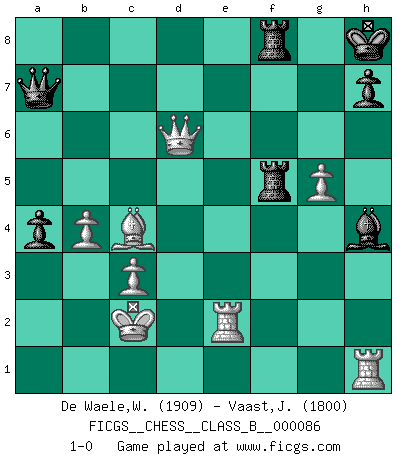 Last move : 1-0 2009 October 9 10:25:42 [Event "FICGS__CHESS__CLASS_B__000086"] [Site "FICGS"] [Date "2009.09.20"] [Round "1"] [White "De Waele,Willy"] [Black "Vaast,Jean-Philippe"] [Result "1-0"] [WhiteElo "1909"] [BlackElo "1800"] 1.e4 c5 2.Nf3 Nc6 3.d4 cxd4 4.Nxd4 Nf6 5.Nc3 e5 6.Ndb5 d6 7.Bg5 a6 8.Na3 b5 9.Nd5 Be7 10.Bxf6 Bxf6 11.c3 O-O 12.Nc2 Bg5 13.a4 bxa4 14.Rxa4 a5 15.Bc4 Rb8 16.b3 Kh8 17.Nce3 g6 18.h4 Bxh4 19.g3 Bg5 20.f4 exf4 21.gxf4 Bh4+ 22.Kd2 Ne7 23.Qg1 Nxd5 24.Nxd5 Be6 25.Qh2 g5 26.Kc2 f6 27.Rha1 f5 28.Qd2 Bxd5 29.Bxd5 fxe4 30.Rxe4 Qb6 31.Rh1 Qa7 32.Re2 a4 33.b4 Rf5 34.Be6 Rfb5 35.Bc4 Rf5 36.Qxd6 Rbf8 37.fxg5 1-0 Sicilian : Pelikan (Lasker/Sveshnikov) variation Kingside Castling by player Black (move 11) Player White won this chess game. Follow this game move after move (download)Chess is really ninety nine percent calculation. (Soltis) Jeder leidlich begabte Spieler, er braucht keineswegs hervorragend veranlagt zu sein, kann es zum Meister bringen. Aber das ist ja auch gar nicht nötig! Der richtige Standpunkt ist es, zu seinem Vergnügen zu spielen, und man glaube ja nicht, dass der Genuss proportional dem Können sei. (Siegbert Tarrasch) Los Peones son nacidos libres, y aún así, se encuentran encadenados por todos lados. (Rick Kennedy) Il s'avisa de me proposer d'apprendre les échecs qu'il jouait un peu... me voilà forcené des échecs. J'achète un échiquier, je m'enferme dans ma chambre, j'y passe des jours et des nuits à vouloir apprendre par cur toutes les parties. (Jean-Jacques Rousseau, Confessions) Be who you are, and say what you feel because those who mind don't matter, and those who matter don't mind. (Dr Seuss)