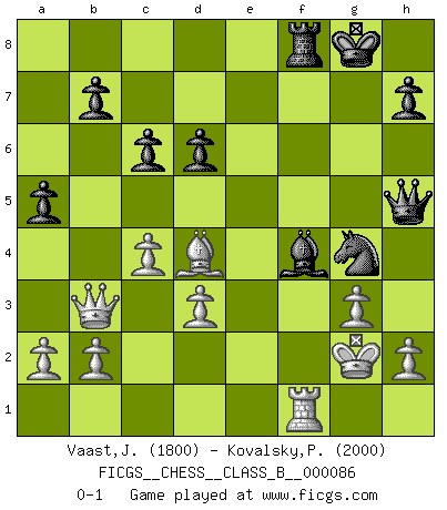 Last move : 0-1 2009 November 4 10:29:41 [Event "FICGS__CHESS__CLASS_B__000086"] [Site "FICGS"] [Date "2009.09.20"] [Round "1"] [White "Vaast,Jean-Philippe"] [Black "Kovalsky,Petr"] [Result "0-1"] [WhiteElo "1800"] [BlackElo "2000"] 1.c4 Nf6 2.g3 g6 3.Bg2 Bg7 4.Nc3 O-O 5.d3 d6 6.e4 e5 7.Nge2 Nc6 8.O-O Be6 9.Nd5 Qd7 10.Bg5 Ng4 11.f3 f6 12.Bd2 Nh6 13.Qb3 Rab8 14.Be3 f5 15.f4 Nd4 16.Nxd4 exd4 17.Bf2 c6 18.Nb4 Ng4 19.exf5 Bxf5 20.Rae1 Rbe8 21.Be4 a5 22.Bxf5 Qxf5 23.Nc2 Rxe1 24.Nxe1 g5 25.Ng2 gxf4 26.Nxf4 Be5 27.Kg2 Bxf4 28.Bxd4 Qh5 0-1 English, 1...Nf6 (Anglo-Indian defense) Kingside Castling by player Black (move 4) Kingside Castling by player White (move 8) Player Black won this chess game. Follow this game move after move (download)It was clear to me that the vulnerable point of the American Grandmaster (Bobby Fischer) was in double-edged, hanging, irrational positions, where he often failed to find a win even in a won position. (Efim Geller) Sehr viele beherrschen heutzutage das große Einmalseins des Schachspiels und kennen sogar dessen Logarithmentafeln auswendig - deshalb sollte man hin und wieder zu beweisen trachten, dass zwei mal zwei auch fünf sein kann. (Mikhail Nekhemyevich Tal) ¿Quién es tu oponente esta tarde? Esta tarde mi oponente son las piezas negras. (Akiba Rubinstein) Des points faibles ou des trous dans la position de l'adversaire doivent être occupés par des pièces et non pas par des pions. (Siegbert Tarrasch) The existence of forgetting has never been proved: We only know that some things don't come to mind when we want them. (Friedrich Nietzsche)