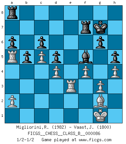 Last move : 1/2-1/2 2009 November 10 19:19:53 [Event "FICGS__CHESS__CLASS_B__000086"] [Site "FICGS"] [Date "2009.09.20"] [Round "1"] [White "Migliorini,Roberto"] [Black "Vaast,Jean-Philippe"] [Result "1/2-1/2"] [WhiteElo "1982"] [BlackElo "1800"] 1.Nf3 f5 2.g3 Nf6 3.Bg2 e6 4.d4 Be7 5.c4 O-O 6.O-O d6 7.Nc3 Qe8 8.Re1 Qg6 9.e4 fxe4 10.Nxe4 Nxe4 11.Rxe4 Nc6 12.Qe2 Bf6 13.Bd2 e5 14.dxe5 Nxe5 15.Nxe5 Bxe5 16.Bc3 Bxc3 17.bxc3 c6 18.Re7 Qf6 19.Rd1 Rb8 20.Qe3 Bf5 21.Re1 a6 22.c5 d5 23.Qd4 Qxd4 24.cxd4 Rf7 25.R7e5 g6 26.h3 Kg7 27.R1e3 b6 28.Rb3 b5 29.Ra3 Ra8 30.Ra5 h5 31.h4 R8a7 32.f4 Ra8 33.Re3 1/2-1/2 Reti v Dutch Kingside Castling by player Black (move 5) Kingside Castling by player White (move 6) This chess game ended in a draw. Follow this game move after move (download)Some part of a mistake is always correct. (Savielly Tartakover) Die Fehler sind da, Sie warten nur darauf gemacht zu werden. (Savielly Grigorievitsch Tartakower) Hay dos clases de hombres: aquellos que se conforman en dejarse llevar por las circunstancias y que juegan barajas y aquellos decididos a controlar las circunstancias y que juegan al Ajedrez. (Mortimer Collins) RxDa4 pat (...) If only people were all showed a certain minimum level of niceness; if only people didn't retract verbal draw offers (without draw box ticked) on ficgs; if only people didn't kill; if only people didn't run concentration / extermination camps, if only people didn't drop nuclear bombs on Hiroshima and Nagasaki, and so on - it would be a much more beautiful world. But sadly, things are not so... (Normajean Yates)