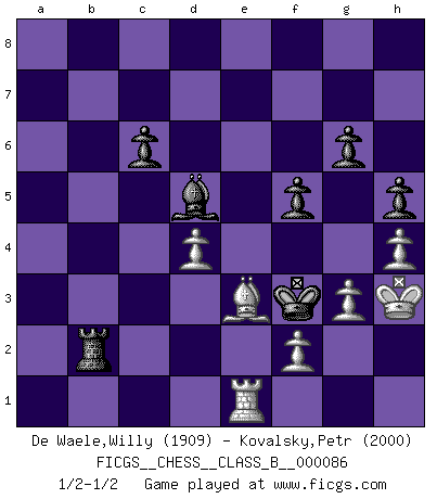 Last move : 1/2-1/2 2009 November 18 5:54:4 [Event "FICGS__CHESS__CLASS_B__000086"] [Site "FICGS"] [Date "2009.09.20"] [Round "1"] [White "De Waele,Willy"] [Black "Kovalsky,Petr"] [Result "1/2-1/2"] [WhiteElo "1909"] [BlackElo "2000"] 1.e4 e5 2.Nf3 Nc6 3.Bb5 a6 4.Ba4 Nf6 5.O-O Be7 6.Re1 b5 7.Bb3 O-O 8.c3 d5 9.exd5 Nxd5 10.Nxe5 Nxe5 11.Rxe5 c6 12.d4 Bd6 13.Re1 Qh4 14.g3 Qh3 15.Be3 Bg4 16.Qd3 Rae8 17.Nd2 Qh5 18.a4 Re6 19.axb5 axb5 20.Qf1 Bh3 21.Bd1 Qf5 22.Qe2 Rfe8 23.Qh5 Qxh5 24.Bxh5 b4 25.Nc4 bxc3 26.bxc3 Nxc3 27.Nxd6 Rxd6 28.Bd2 Rxe1+ 29.Rxe1 g6 30.Bf3 Nd5 31.Bh6 Re6 32.Ra1 Re8 33.Rb1 f6 34.Bd2 Ra8 35.Be4 Kf7 36.Bd3 Ra4 37.Be3 Ke6 38.Bc2 Ra3 39.Bh6 Nc3 40.Re1+ Kd7 41.Be3 Ne2+ 42.Kh1 f5 43.Rb1 Kd6 44.Rd1 Kd5 45.Bd3 Bg4 46.Bxe2 Bxe2 47.Rc1 Bf3+ 48.Kg1 Ra6 49.h3 Ke4 50.Kh2 h5 51.h4 Kd3 52.Rb1 Be4 53.Kh3 Ra2 54.Rd1+ Ke2 55.Rc1 Rb2 56.Ra1 Bd5 57.Rc1 Kf3 58.Re1 1/2-1/2 Ruy Lopez : Closed, 7...O-O Kingside Castling by player White (move 5) Kingside Castling by player Black (move 7) This chess game ended in a draw. Follow this game move after move (download)Tactics flow from a superior position. (Bobby Fischer) Die Arbeit ist etwas Unnatürliches. Die Faulheit allein ist göttlich. (Anatole France) El Ajedrez es en su esencia, un juego. En su forma, un arte. Y en su ejecución, una ciencia. (Baron Tassilo) Il vaut toujours mieux jouer un plan faux de façon logique que de n'avoir pas de plan du tout. (Victor Kortchnoï) A good aphorism is too hard for the tooth of time, and is not worn away with the centuries, although it serves as food for every speech. (Friedrich Nietzsche)