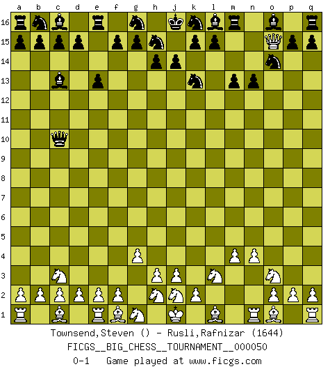 Last move : 0-1 2009 November 12 19:10:58 [Event "FICGS__BIG_CHESS__TOURNAMENT__000050"] [Site "FICGS"] [Date "2009.09.23"] [Round "1"] [White "Townsend,Steven"] [Black "Rusli,Rafnizar"] [Result "0-1"] [WhiteElo ""] [BlackElo "1644"] 1.g2-g4 j15-k13 2.p1-o3 h16-o10 3.h1-g2 o10-c10 4.b1-c3 c10-l2 5.k1-l3 e15-e13 6.n2-n4 l2-c10 7.m1-n1 f16-c13 8.m2-m4 n15-n13 9.g2-d5 p16-o14 10.d5-o15 m15-m13 0-1 Follow this game move after move (download)It's just you and your opponent at the board and you're trying to prove something. (Bobby Fischer) Darum geht es im Schach. Einen Tag gibst du deinem Gegner eine Lektion, am nächsten Tag gibt er dir eine. (Robert James Fischer) Fischer deseaba darle a los Rusos una sopa de su propia medicina. (Larry Evans) Il s'avisa de me proposer d'apprendre les échecs qu'il jouait un peu... me voilà forcené des échecs. J'achète un échiquier, je m'enferme dans ma chambre, j'y passe des jours et des nuits à vouloir apprendre par cur toutes les parties. (Jean-Jacques Rousseau, Confessions) Programming can only do so much before it becomes too much. (Don Groves)