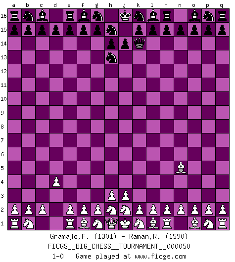 Last move : 1-0 2009 October 27 7:43:53 [Event "FICGS__BIG_CHESS__TOURNAMENT__000050"] [Site "FICGS"] [Date "2009.09.23"] [Round "1"] [White "Gramajo,Francisco"] [Black "Raman,Ranganathan"] [Result "1-0"] [WhiteElo "1301"] [BlackElo "1590"] 1.d2-d4 j15-h13 2.c1-k8 h16-k14 3.k8-n5 1-0 This big chess game has been lost on time (started : 2009.09.23 19:32:30) Follow this game move after move (download)The Pin is mightier than the sword. (Fred Reinfeld) Im Blitz ist es einfacher mit einer Figur weniger anzugreifen, als sich mit einer Mehrfigur zu verteidigen. (Mikhail Nekhemyevich Tal) El Ajedrez, como cualquier otra actividad creativa, puede existir solo a través de méritos combinados de aquellos que tienen talento creativo y de aquellos que tienen la habilidad de organizar un trabajo creativo. (Mikhail Botvinnik) Le pion, dans sa simplicité, marche droit devant lui, mais lorsqu'il prend, il le fait obliquement? Ainsi l'homme, tant qu'il reste pauvre, marche dans la droiture et vit honnêtement, mais lorsqu'il recherche les honneurs, il flatte, se parjure et, par les voies obliques, cherche une position supérieure sur l'échiquier du monde. (Jean de Galles) I take risks, sometimes patients die, but not taking risks causes more patients to die. So I guess my biggest problem is I've been cursed with the ability to do the math. (Gregory House, House M.D.)