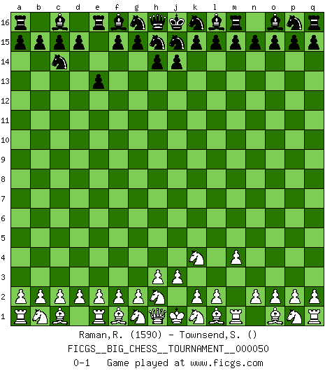 Last move : 0-1 2009 October 31 8:2:23 [Event "FICGS__BIG_CHESS__TOURNAMENT__000050"] [Site "FICGS"] [Date "2009.09.23"] [Round "1"] [White "Raman,Ranganathan"] [Black "Townsend,Steven"] [Result "0-1"] [WhiteElo "1590"] [BlackElo ""] 1.j2-k4 b16-c14 2.m2-m4 e15-e13 0-1 This big chess game has been lost on time (started : 2009.09.23 19:32:30) Follow this game move after move (download)Via the squares on the chessboard, the Indians explain the movement of time and the age, the higher influences which control the world and the ties which link Chess with the human soul. (Al-Masudi) Charakterschwächen offenbaren sich normalerweise während einer Schachpartie. (Garry Kasparov) Me siento como si fuera una pieza en una partida de Ajedrez, cuando mi oponente me indica: esa pieza no puede ser movida. (Soren Kierkegaard) Le génie consiste à savoir transgresser les règles au moment opportun. (Teichmann) The project of the man are lower than those of the sky. (Chinese proverb)