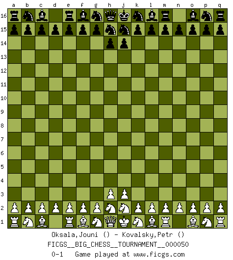 Last move : 0-1 2009 October 23 20:22:26 [Event "FICGS__BIG_CHESS__TOURNAMENT__000050"] [Site "FICGS"] [Date "2009.09.23"] [Round "1"] [White "Oksala,Jouni"] [Black "Kovalsky,Petr"] [Result "0-1"] [WhiteElo ""] [BlackElo ""] 0-1 This big chess game has been lost on time (started : 2009.09.23 19:32:30) Follow this game move after move (download)I know people who have all the will in the world, but still can't play good Chess. (Bobby Fischer) Ich habe die besten Aussichten, den ersten Preis zu gewinnen - denn jeder muss gegen Steinitz spielen, nur ich nicht! (Wilhelm Steinitz) Yo tuve un dolor de muelas en la primer partida. En el segundo juego, tuve un dolor de cabeza. En el tercero, tuve un ataque de reumatísmo. En la cuarta partida, no me sentía muy bien. ¿Y en el quinto juego? Bueno, ¿que acaso uno tiene que ganar todos los juegos?. (Siegbert Tarrasch) Même un GMI sait rarement calculer sur plus de cinq coups une attaque à sacrifices. (Rudolf Spielmann) Are you threatening me, Master Jedi ? (Chancellor Palpatine in Star Wars ep.3)