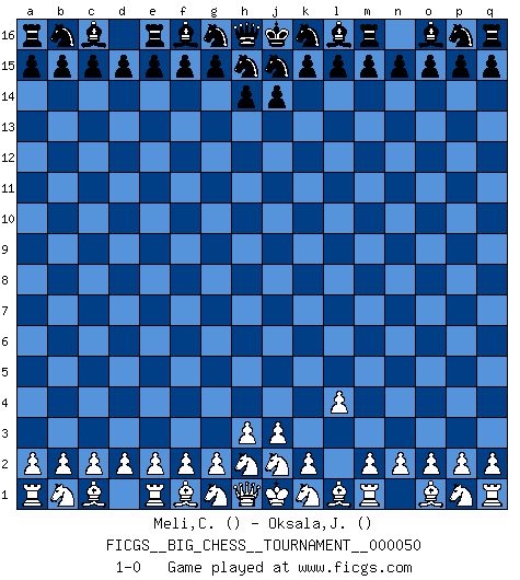 Last move : 1-0 2009 October 23 20:22:26 [Event "FICGS__BIG_CHESS__TOURNAMENT__000050"] [Site "FICGS"] [Date "2009.09.23"] [Round "1"] [White "Meli,Cosimo Leonardo"] [Black "Oksala,Jouni"] [Result "1-0"] [WhiteElo ""] [BlackElo ""] 1.l2-l4 1-0 This big chess game has been lost on time (started : 2009.09.23 19:32:30) Follow this game move after move (download)Chess is a sea in which a gnat may drink and an elephant may bathe. (Hindu proverb) Über Frauen: Chess is better. (Robert James Fischer) Personalmente, yo prefiero mirar hacia el futuro en donde un programa de computadora gane el título mundial de Ajedrez. La humanidad necesita una lección de humildad. (Richard Dawkings) Il (Jacob Murray) ne joue pas pour le bon coup, mais pour le meilleur. (Eloi Relange) No, I am still playing. (Anatoly Karpov)