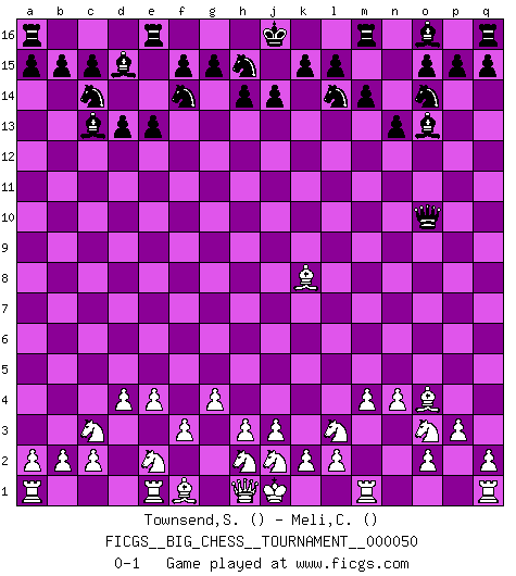 Last move : 0-1 2009 November 15 8:53:32 [Event "FICGS__BIG_CHESS__TOURNAMENT__000050"] [Site "FICGS"] [Date "2009.09.23"] [Round "1"] [White "Townsend,Steven"] [Black "Meli,Cosimo Leonardo"] [Result "0-1"] [WhiteElo ""] [BlackElo ""] 1.f2-f3 g16-f14 2.g2-g4 n15-n13 3.p1-o3 m15-m14 4.n2-n4 l16-o13 5.e2-e4 d15-d13 6.k1-l3 e15-e14 7.g1-e2 f16-c13 8.m2-m4 b16-c14 9.b1-c3 p16-o14 10.o1-f9 j15-l14 11.d2-d4 h16-p9 12.f9-l14 k16-l14 13.p2-p3 p9-o10 14.l1-o4 c16-d15 15.c1-k8 e14-e13 0-1 This big chess game has been lost on time (started : 2009.09.23 19:32:30) Follow this game move after move (download)The isolated Pawn casts gloom over the entire chessboard. (Aaron Nimzovich) Du kannst im Schach nur gut werden, wenn du das Spiel liebst. (Robert James Fischer) No hay otro maestro que tenga una voluntad terrífica de ganar. Al tablero, el irradía peligro y aún los oponentes mas fuertes tienden a congelarse como liebres cuando olfatean a una pantera. Aún sus debilidades son peligrosas. Con las blancas, su juego de apertura es predecible - te es posible hacer planes en su contra - pero es tan fuerte que tus planes casi nunca funcionan. En el juego medio, su precisión e invención son fabulosas y en finales, tú simplemente no le puedes vencer. (Experto Alemán anónimo) Il n'y a pas eu de défaite parce que je ne crois pas que cet ordinateur ait jamais existé. IBM a triché en refusant d'imprimer les modes de recherche de la machine. C'est évident, pendant le match, des coups décisifs ont été joués par des êtres humains. Aujourd'hui, les meilleurs spécialistes en informatique ne peuvent toujours pas expliquer comment Deep-Blue a pu jouer contre la logique des ordinateurs. IBM a gagné une guerre de communication, mais ils sont incapables de prouver que l'ordinateur a gagné tout seul. (Garry Kasparov) Fame, I have already. Now I need the money. (an elderly Steinitz)