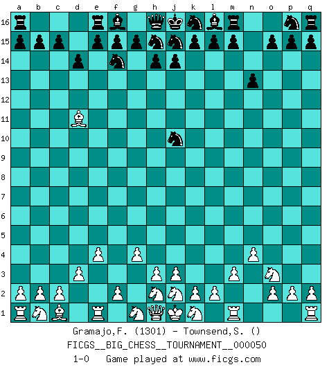 Last move : 1-0 2009 November 6 20:19:41 [Event "FICGS__BIG_CHESS__TOURNAMENT__000050"] [Site "FICGS"] [Date "2009.09.23"] [Round "1"] [White "Gramajo,Francisco"] [Black "Townsend,Steven"] [Result "1-0"] [WhiteElo "1301"] [BlackElo ""] 1.p1-o3 b16-c14 2.n2-n4 n15-n13 3.o1-b13 c14-d12 4.b13-d11 d15-d14 5.m2-m3 g16-f14 6.l1-n3 d12-f11 7.e2-e4 o16-g9 8.n3-g9 f11-g9 9.f1-c4 c16-k9 10.d2-d3 k9-j10 11.c4-j10 g9-j10 12.g2-g4 1-0 This big chess game has been lost on time (started : 2009.09.23 19:32:30) Follow this game move after move (download)The passed pawn is a criminal, who should be kept under lock and key. Mild measures, such as police surveillance, are not sufficient. (Nimzovitch) Offensichtlich kennt Kasparow nichts anderes als Schach, und ich könnte 500 weitere Spieler dieser Sorte benennen. (Judith Polgar) El Ajedrez detiene a su maestro dentro de sus propios vínculos, encadenando la mente y el cerebro, por lo que la libertad interior del mas fuerte debe sufrir. (Albert Einstein) Si je n'étais pas joueur d'échecs, je serais le meilleur dans quelque chose d'autre. (Anatoli Karpov) Information on the Internet is subject to the same rules and regulations as conversation at a bar. (George Lundberg)