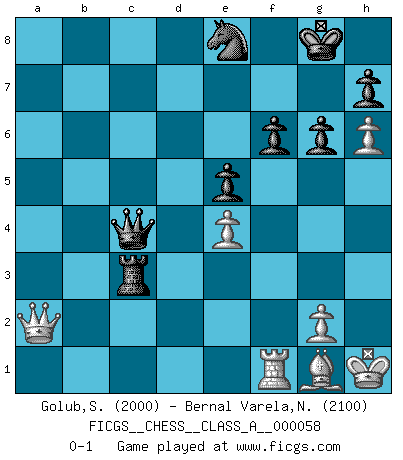 Last move : 0-1 2010 August 7 10:13:54 [Event "FICGS__CHESS__CLASS_A__000058"] [Site "FICGS"] [Date "2009.09.23"] [Round "1"] [White "Golub,Sergey"] [Black "Bernal Varela,Nelson"] [Result "0-1"] [WhiteElo "2000"] [BlackElo "2100"] 1.d4 Nf6 2.c4 g6 3.Nc3 d5 4.cxd5 Nxd5 5.e4 Nxc3 6.bxc3 Bg7 7.Bc4 c5 8.Ne2 O-O 9.O-O Nc6 10.Be3 Na5 11.Bd3 b6 12.Rc1 e5 13.dxc5 Be6 14.c4 bxc5 15.Bxc5 Bh6 16.f4 Re8 17.f5 Qc7 18.Bf2 Bxc4 19.Bxc4 Nxc4 20.Nc3 Bxc1 21.Nd5 Qd8 22.Qxc1 Nd6 23.Qe3 Nxf5 24.Qf3 Nd6 25.Nf6+ Kg7 26.Nxe8+ Nxe8 27.Bg3 Qd4+ 28.Kh1 f6 29.Bh4 Qb6 30.Bf2 Qc7 31.h4 Rd8 32.h5 Qf7 33.a4 Qc4 34.Bxa7 Rd3 35.Qg4 Qxa4 36.Bc5 Qd7 37.Qe2 Rc3 38.h6+ Kg8 39.Bg1 Qc6 40.Qa2+ Qc4 0-1 This chess game has been lost on time (started : 2009.09.23 23:53:18) King's Indian defense, 3.Nc3 Kingside Castling by player Black (move 8) Kingside Castling by player White (move 9) Player Black won this chess game. Follow this game move after move (download)Life is a kind of Chess, with struggle, competition, good and ill events. (Benjamin Franklin) Ein bischen Romantik kann weder im Schach noch in der Liebe schaden. Also versuche ich mich ab und zu daran zu erinnern. (Nigel Short) Durante una competencia de Ajedrez, un Maestro de Ajedrez deberá ser una combinación de presa de caza y un Monge. (Alexander Alekhine) Les Echecs représentent une sphère d'idées créatrices basée sur la volonté des deux protagonistes. (Smyslov) The next best thing to gambling and winning is gambling and loosing. (Nick Dandalos)