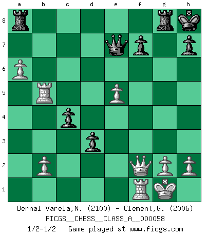 Last move : 1/2-1/2 2009 December 17 18:35:55 [Event "FICGS__CHESS__CLASS_A__000058"] [Site "FICGS"] [Date "2009.09.23"] [Round "1"] [White "Bernal Varela,Nelson"] [Black "Clement,George"] [Result "1/2-1/2"] [WhiteElo "2100"] [BlackElo "2006"] 1.e4 e5 2.Nf3 Nc6 3.Bb5 a6 4.Ba4 Nf6 5.O-O Nxe4 6.d4 b5 7.Bb3 d5 8.Nxe5 Nxe5 9.dxe5 Be6 10.Be3 Bc5 11.Bxc5 Nxc5 12.f4 g6 13.Qd4 Ne4 14.c3 O-O 15.Rd1 Bg4 16.Re1 Qh4 17.Qe3 Rfd8 18.Nd2 Nxd2 19.Qxd2 c5 20.a4 Be6 21.Red1 b4 22.cxb4 Rab8 23.b5 Qe7 24.Bc2 axb5 25.a5 Ra8 26.Qf2 d4 27.f5 Bxf5 28.Bxf5 gxf5 29.Qxf5 c4 30.Rf1 d3 31.a6 Re8 32.Ra5 Kh8 33.Qf2 Rg8 34.Rxb5 1/2-1/2 Ruy Lopez : Open, 7.Bb3 Kingside Castling by player White (move 5) Kingside Castling by player Black (move 14) This chess game ended in a draw. Follow this game move after move (download)Up to this point White has been following well-known analysis. But now he makes a fatal error: he begins to use his own head. (Siegbert Tarrasch) Es gibt Leute, die glauben, alles wäre vernünftig, was man mit einem ernsthaften Gesicht tut. (Georg Christoph Lichtenberg) Ser exitoso en el Ajedrez te permite descubrir tu propia personalidad. Eso es lo que deseo para los niños de mi clase. (Saudin Robovic) Même un GMI sait rarement calculer sur plus de cinq coups une attaque à sacrifices. (Rudolf Spielmann) Knowledge rests not upon truth alone, but upon error also. (Carl G. Jung)