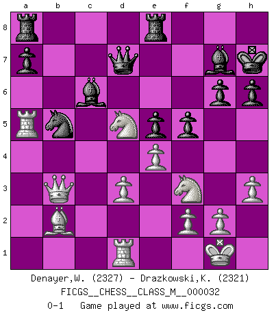 Last move : 0-1 2010 May 1 7:39:35 [Event "FICGS__CHESS__CLASS_M__000032"] [Site "FICGS"] [Date "2009.09.24"] [Round "1"] [White "Denayer,Will"] [Black "Drazkowski,Krzysztof"] [Result "0-1"] [WhiteElo "2327"] [BlackElo "2321"] 1.e4 c5 2.Nf3 Nc6 3.Bb5 g6 4.Bxc6 dxc6 5.d3 Bg7 6.h3 e5 7.Be3 b6 8.O-O f6 9.a3 Nh6 10.b4 cxb4 11.axb4 Nf7 12.Nc3 O-O 13.b5 Bb7 14.Qb1 Qd7 15.Qb3 cxb5 16.Nxb5 Bc6 17.c4 f5 18.Nc3 h6 19.Rfd1 Kh7 20.Bc1 Rfc8 21.Nd5 b5 22.Ra5 Nd6 23.cxb5 Nxb5 24.Bb2 Re8 0-1 Sicilian : Nimzovich-Rossolimo attack (with ...g6, without ...d6) Kingside Castling by player White (move 8) Kingside Castling by player Black (move 12) Player Black won this chess game. Follow this game move after move (download)It is not enough to be a good player... you must also play well. (Siegbert Tarrasch) Es macht mich traurig, wenn ich sehe, dass Golfprofis mehr verdienen als Schachsportler. Obwohl ich davon überzeugt bin, dass wir Schachspieler viel härter trainieren müssen als die Golfer. (Alexandra Kosteniuk) Un mal día en el Ajedrez, es mejor que cualquier buen día en el trabajo. (Anonymous) Le temps de noter son nom sur la feuille de partie, j'étais déjà en zeitnot ! D'un modeste amateur apparié lors de la première ronde d'un open contre le grand-maître Azmaïparashvili. If you have any trouble condescending, find a Unix user to show you how it's done. (Scott Adams)