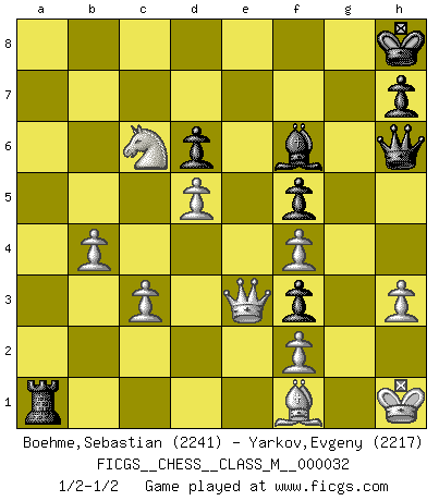 Last move : 1/2-1/2 2010 July 22 18:15:45 [Event "FICGS__CHESS__CLASS_M__000032"] [Site "FICGS"] [Date "2009.09.24"] [Round "1"] [White "Boehme,Sebastian"] [Black "Yarkov,Evgeny"] [Result "1/2-1/2"] [WhiteElo "2241"] [BlackElo "2217"] 1.e4 c5 2.Nf3 Nc6 3.d4 cxd4 4.Nxd4 Nf6 5.Nc3 e5 6.Ndb5 d6 7.Bg5 a6 8.Na3 b5 9.Bxf6 gxf6 10.Nd5 f5 11.Bd3 Be6 12.O-O Bxd5 13.exd5 Ne7 14.Re1 Bg7 15.c3 O-O 16.Nc2 Re8 17.g3 e4 18.Bf1 Ng6 19.a4 bxa4 20.Rxa4 Rb8 21.Nb4 Ne5 22.Nc6 Nf3+ 23.Kh1 Qg5 24.Nxb8 Nxe1 25.Nc6 Nf3 26.Bg2 Qh5 27.h3 f4 28.Qe2 f5 29.gxf4 Bf6 30.Rxa6 Qg6 31.Ra1 Nh4 32.Rg1 Kh8 33.Bf1 Qh6 34.Qe3 Nf3 35.Rg3 Ra8 36.b4 Ra1 37.Rxf3 exf3 1/2-1/2 Sicilian : Pelikan (Lasker/Sveshnikov) variation Kingside Castling by player White (move 12) Kingside Castling by player Black (move 15) This chess game ended in a draw. Follow this game move after move (download)There is no remorse like the remorse of Chess. (H. G. Wells) Du kannst im Schach nur gut werden, wenn du das Spiel liebst. (Robert James Fischer) No solamente yo pronostico su triunfo sobre Botvinnik, sino que me adelanto y digo que probablemente Fischer es el jugador de Ajedrez mas grande que haya existido. (John Collins) Pour moi, les échecs ne sont pas un jeu mais un art. (Alexandre Alekhine) Wisdom is the reward you get for a lifetime of listening when you'd have preferred to talk. (Doug Larson)