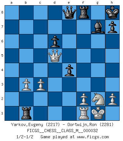 Last move : 1/2-1/2 2010 January 13 15:42:53 [Event "FICGS__CHESS__CLASS_M__000032"] [Site "FICGS"] [Date "2009.09.24"] [Round "1"] [White "Yarkov,Evgeny"] [Black "Oortwijn,Ron"] [Result "1/2-1/2"] [WhiteElo "2217"] [BlackElo "2281"] 1.e4 c5 2.Nf3 Nc6 3.d4 cxd4 4.Nxd4 Nf6 5.Nc3 e5 6.Ndb5 d6 7.Bg5 a6 8.Na3 b5 9.Bxf6 gxf6 10.Nd5 f5 11.c3 Bg7 12.exf5 Bxf5 13.Nc2 O-O 14.Nce3 Be6 15.Bd3 f5 16.Qh5 e4 17.Bc2 Ne7 18.Rd1 Nxd5 19.Nxd5 b4 20.Nxb4 a5 21.Nd5 Rb8 22.Bb3 a4 23.Bxa4 Rxb2 24.Bb3 f4 25.O-O f3 26.Ne3 Bxb3 27.axb3 fxg2 28.Qd5+ Kh8 29.Nxg2 Qe8 30.Rb1 Rxb1 1/2-1/2 Sicilian : Pelikan (Lasker/Sveshnikov) variation Kingside Castling by player Black (move 13) Kingside Castling by player White (move 25) This chess game ended in a draw. Follow this game move after move (download)During a Chess competition a Chessmaster should be a combination of a beast of prey and a monk. (Alexander Alekhine) Die FIDE ist dabei in die Hände der russischen Mafia zu fallen. (Larry Evans) A través de las casillas del tablero, los Indios explican el movimiento del tiempo y la edad, las influencias mas altas que controlan el mundo y los lazos que vinculan al Ajedrez con el alma humana. (Al-Masudi) Le génie consiste à savoir transgresser les règles au moment opportun. (Teichmann) The human is the only animal species whose members are able to talk themselves into difficulties that would not otherwise exist. (Wendell Johnson)