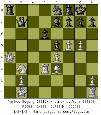 Last move : 1/2-1/2 2010 March 3 16:14:23 [Event "FICGS__CHESS__CLASS_M__000032"] [Site "FICGS"] [Date "2009.09.24"] [Round "1"] [White "Yarkov,Evgeny"] [Black "Lemekhov,Yura"] [Result "1/2-1/2"] [WhiteElo "2217"] [BlackElo "2250"] 1.e4 c5 2.Nf3 d6 3.d4 cxd4 4.Nxd4 Nf6 5.Nc3 a6 6.Be3 e5 7.Nb3 Be6 8.f3 Be7 9.Qd2 O-O 10.O-O-O Nbd7 11.g4 b5 12.g5 b4 13.Ne2 Ne8 14.f4 a5 15.f5 Bxb3 16.cxb3 a4 17.bxa4 Rxa4 18.Kb1 Rxa2 19.Nc1 Ra8 20.Nb3 Qb8 21.Bc4 Nb6 22.Qxb4 Nxc4 23.Qxc4 Qb7 24.Rd3 Rc8 25.Qa4 Ra8 26.Qc4 Rc8 27.Qa4 Ra8 1/2-1/2 Sicilian : Najdorf, Byrne (English) attack Kingside Castling by player Black (move 9) Queenside Castling by player White (move 10) This chess game ended in a draw. Follow this game move after move (download)Only sissies Castle. (Rob Sillars) Besser ein falscher Plan, logisch durchgeführt, als gar kein Plan. (Viktor Kortschnoi) Un juego de Ajedrez es un dialogo, una conversación entre un jugador y su oponente. Cada movimiento del oponente puede contener amenazas o tropiezos, pero un jugador no se puede defender de las amenazas o tomar ventaja de los tropiezos si es que no se pregunta a sí mismo: ¿Que es lo que mi oponente va a hacer después de cada movida?. (Bruce A. Moon) Il n'y a plus de joueurs du niveau de Jacob Murray dont la seule quête est le beau jeu, le plaisir de voir les pièces construire quelque chose. Sur 10 idées à la minute, 9 seront sans intérêt, la dernière s'avèrera géniale. (Christian Bauer) Fortune favours the audacious. (Desiderius Erasmus)