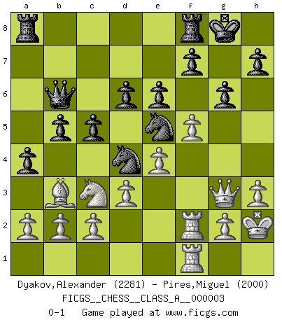 Last move : 0-1 2006 October 24 7:42:14 [Event "FICGS__CHESS__CLASS_A__000003"] [Site "FICGS"] [Date "2006.04.22"] [Round "1"] [White "Dyakov,Alexander"] [Black "Pires,Miguel"] [Result "0-1"] [WhiteElo "2281"] [BlackElo "2000"] 1.e4 c5 2.Nc3 d6 3.f4 Nf6 4.Nf3 g6 5.Bc4 Bg7 6.O-O Nc6 7.d3 Bg4 8.h3 Bxf3 9.Qxf3 O-O 10.Be3 Nd7 11.Bb3 e6 12.f5 Nd4 13.Qg3 Be5 14.Bf4 b5 15.Rf2 Qb6 16.Bxe5 Nxe5 17.Kh2 a5 18.Raf1 a4 0-1 This chess game has been lost on time (started : 2006.04.22 19:40:33) Sicilian : Closed Kingside Castling by player White (move 6) Kingside Castling by player Black (move 9) Player Black won this chess game. Follow this game move after move (download)A chess genius has died; a loss for humanity. (Viktor Kortchnoi, about Bobby Fischer's death) Er war ein guter Schachspieler, aber ich kann Leute nicht ausstehen, die 'Heil Hitler' rufen (Über Alexander Aljechin). (Miguel Najdorf) Preferería tener un Peón que un dedo. (Reuben Fine) Karpov est une pièce de musée. (Garry Kasparov) Bobby never cared about money, though. His only desire was to prove that his choices were correct: He wanted chess to be important because he was a chess player, and he wanted to be important. Bobby knew money was important, but he didn't have a clue why, outside of clothes and status. The only way he could accomplish what he wanted was to fight for a lot of money. Once he got it, he gave it away. He did not know how to spend it. And once he'd become champion, after, essentially, sacrificing his life for it, he didn't know how to spend his time. (Bob Wade)