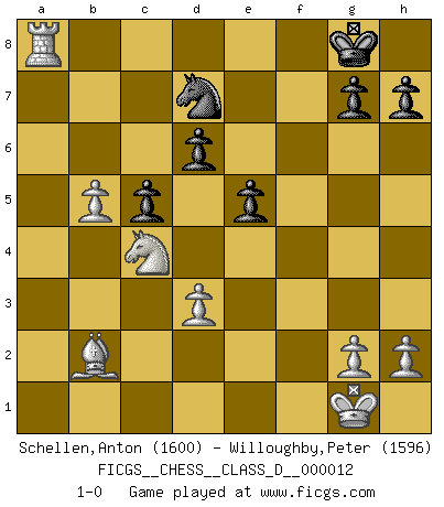 Last move : 1-0 2006 October 9 21:21:31 [Event "FICGS__CHESS__CLASS_D__000012"] [Site "FICGS"] [Date "2006.09.28"] [Round "1"] [White "Schellen,Anton"] [Black "Willoughby,Peter"] [Result "1-0"] [WhiteElo "1600"] [BlackElo "1596"] 1.b4 e5 2.Bb2 d6 3.e3 Nf6 4.Nf3 Be7 5.Be2 Nfd7 6.O-O O-O 7.d3 f6 8.c4 c5 9.b5 a6 10.a4 axb5 11.cxb5 b6 12.Nc3 Bb7 13.Nd2 f5 14.Bf3 Bxf3 15.Qxf3 Rf7 16.Qxa8 Qf8 17.Nc4 f4 18.exf4 Rxf4 19.Nd5 Rf7 20.Ndxb6 Bh4 21.Nxd7 Rxd7 22.a5 Rf7 23.a6 Bxf2+ 24.Rxf2 Rxf2 25.a7 Nd7 26.Qxf8+ Rxf8 27.a8Q Rxa8 28.Rxa8+ 1-0 Polish (Sokolsky) opening Kingside Castling by player White (move 6) Kingside Castling by player Black (move 6) Promotion Queen by player White (move 27) Player White won this chess game. Follow this game move after move (download)In Chess, just as in life, today's bliss may be tomorrow's poison. (Assaic) Wie gewinnt Tal? Er entwickelt alle seine Figuren in die Brettmitte und opfert sie dann irgendwo. (Robert James Fischer) Un sacrificio se refuta mucho mejor al aceptarlo. (Wilhelm Steinitz) Les Echecs ont trois composantes : le temps, l'espace et le matériel en dernier. (Mikhail Tal) Even the best needles are not sharp at both ends. (Chinese proverb)