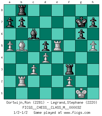 Last move : 1/2-1/2 2010 February 4 7:49:46 [Event "FICGS__CHESS__CLASS_M__000032"] [Site "FICGS"] [Date "2009.09.24"] [Round "1"] [White "Oortwijn,Ron"] [Black "Legrand,Stephane"] [Result "1/2-1/2"] [WhiteElo "2281"] [BlackElo "2220"] 1.e4 e5 2.Nf3 Nf6 3.d4 Nxe4 4.Bd3 d5 5.Nxe5 Nd7 6.Nxd7 Bxd7 7.O-O Bd6 8.c4 c6 9.cxd5 cxd5 10.Nc3 Nxc3 11.bxc3 O-O 12.Qh5 f5 13.Qf3 Kh8 14.Bf4 Qc7 15.Bxd6 Qxd6 16.Rfb1 Rab8 17.a4 g6 18.a5 Rfe8 19.h4 Re7 20.g3 f4 21.Qxf4 Qxf4 22.gxf4 Rf7 23.Rb2 Rxf4 24.Re1 Kg7 25.Re5 Bc6 26.h5 Rf3 27.Bb5 1/2-1/2 Petrov : Modern attack, Symmetrical variation Kingside Castling by player White (move 7) Kingside Castling by player Black (move 11) This chess game ended in a draw. Follow this game move after move (download)Chess is in its essence a game, in its form an art, and in its execution a science. (Baron Tassilo) Zum Sieg gelangt man nicht, wenn man gut, sondern nur wenn man besser spielt (Savielly Grigorievitsch Tartakower) El Ajedrez es un juego de pelea el cual es puramente intelectual e incluye la suerte. (Richard Reti) On croit qu'il y a plus de mauvais joueurs que de bons joueurs, c'est faux : Il y a autant de joueurs qui gagnent que de joueurs qui perdent. (Philippe Geluck) There is no instance of a country having benefited from prolonged warfare. (Sun Tzu)