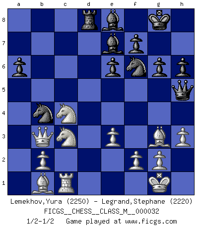 Last move : 1/2-1/2 2010 March 3 23:27:18 [Event "FICGS__CHESS__CLASS_M__000032"] [Site "FICGS"] [Date "2009.09.24"] [Round "1"] [White "Lemekhov,Yura"] [Black "Legrand,Stephane"] [Result "1/2-1/2"] [WhiteElo "2250"] [BlackElo "2220"] 1.d4 Nf6 2.c4 e6 3.Nf3 d5 4.Nc3 Be7 5.Bg5 O-O 6.Qc2 h6 7.Bh4 dxc4 8.e3 c5 9.Bxc4 cxd4 10.Nxd4 Bd7 11.O-O Nc6 12.Rad1 Qc8 13.Nf3 Rd8 14.a3 a6 15.Ba2 Be8 16.Bb1 Qc7 17.Bg3 Qa5 18.Nd2 b5 19.h3 Rac8 20.Rc1 g6 21.Rfd1 b4 22.Nc4 Qh5 23.Rxd8 Rxd8 24.axb4 Nxb4 25.Qb3 1/2-1/2 Queen's pawn game Kingside Castling by player Black (move 5) Kingside Castling by player White (move 11) This chess game ended in a draw. Follow this game move after move (download)Chess is a terrible game. If you have no center, your opponent has a freer position. If you do have a center, then you really have something to worry about ! (Siegbert Tarrasch) Der vorletzte Fehler gewinnt. (Savielly Grigorievitsch Tartakower) Yo creo que el Ajedrez posee una magia que es también una ayuda en la edad avanzada. Una rodilla reumática es olvidada durante una partida de Ajedrez y otros eventos pueden parecer algo sin importancia comparada a una catástrofe en el tablero de Ajedrez. (Vlastimil Hort) Le joueur d'Echecs qui veut atteindre le top est obligé de développer son propre credo créatif. Alexeï Stepanovicth Souétine. Il est facile d'écrire des livres ! Ce qui est difficile, c'est de jouer ! (Alexeï Stepanovicth Souétine) The meaning of life is that it is to be lived, and it is not to be traded and conceptualized and squeezed into a pattern of systems. (Bruce Lee)