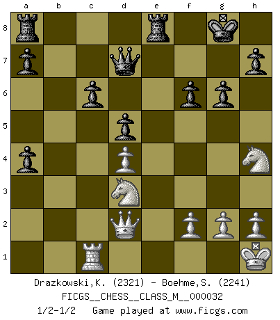 Last move : 1/2-1/2 2010 May 13 21:44:31 [Event "FICGS__CHESS__CLASS_M__000032"] [Site "FICGS"] [Date "2009.09.24"] [Round "1"] [White "Drazkowski,Krzysztof"] [Black "Boehme,Sebastian"] [Result "1/2-1/2"] [WhiteElo "2321"] [BlackElo "2241"] 1.d4 d5 2.c4 e6 3.cxd5 exd5 4.Nc3 c6 5.Qc2 Bd6 6.Nf3 Ne7 7.Bg5 f6 8.Bh4 Bf5 9.Qd2 Bg6 10.e3 O-O 11.Bd3 Bxd3 12.Qxd3 Na6 13.a3 Nc7 14.Bg3 Re8 15.Na4 Nc8 16.Nc5 Rb8 17.Rc1 Qe7 18.b4 Ne6 19.a4 Ra8 20.Nh4 g6 21.a5 b6 22.Bxd6 Qxd6 23.Na6 Qd7 24.O-O Nd6 25.b5 Nxb5 26.Nb4 Nbxd4 27.exd4 Nf4 28.Qd2 Ne2+ 29.Kh1 Nxc1 30.Rxc1 bxa5 31.Nd3 a4 1/2-1/2 Queen's gambit declined Kingside Castling by player Black (move 10) Kingside Castling by player White (move 24) This chess game ended in a draw. Follow this game move after move (download)I have added these principles to the law: get the Knights into action before both Bishops are developed. (Emanuel Lasker) Schach ist ein Reich, wo sich die menschliche Phantasie frei entfalten kann. (David Bronstein) La última cosa en que Fischer estaba interesado era en tonterías, siempre y cuando el Ajedrez estuviera involucrado. (Elie Agur) Aux échecs, l'amour-propre est satisfait quand on remporte la victoire, mais il n'y a pas de honte à être battu. (Benjamin Franklin) For peace of mind, resign as general manager of the universe. (Douglas Adams)