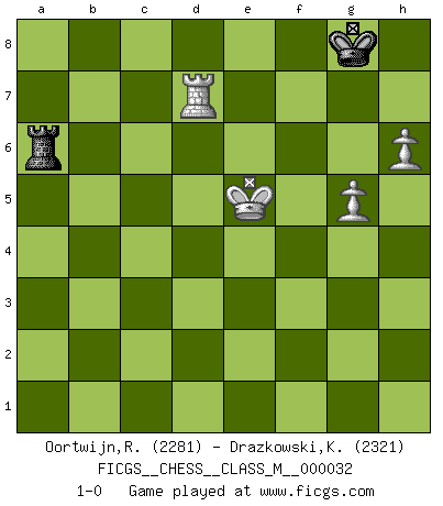 Last move : 1-0 2010 November 10 20:42:38 [Event "FICGS__CHESS__CLASS_M__000032"] [Site "FICGS"] [Date "2009.09.24"] [Round "1"] [White "Oortwijn,Ron"] [Black "Drazkowski,Krzysztof"] [Result "1-0"] [WhiteElo "2281"] [BlackElo "2321"] 1.Nf3 Nf6 2.d4 d5 3.c4 e6 4.Nc3 Be7 5.Bg5 O-O 6.e3 c6 7.Rc1 Nbd7 8.Bd3 dxc4 9.Bxc4 Nd5 10.Bxe7 Qxe7 11.O-O Nxc3 12.Rxc3 e5 13.Bb3 exd4 14.exd4 Nf6 15.Re1 Qd6 16.Ne5 Nd5 17.Rg3 Be6 18.Bc2 Nf6 19.Qd2 g6 20.Qh6 Qxd4 21.Nxg6 fxg6 22.Bxg6 Kh8 23.Bf5 Rf7 24.Bxe6 Ng4 25.Qc1 Nxf2 26.Qe3 Qxe3 27.Rgxe3 R7f8 28.Bb3 Ng4 29.Re7 Rab8 30.Bc2 Nf6 31.R1e6 h6 32.b4 a6 33.h3 h5 34.Rc7 Rbe8 35.Rxe8 Rxe8 36.Rxb7 Re2 37.Bb3 Nd5 38.Bxd5 cxd5 39.a4 Re4 40.Kf2 a5 41.bxa5 Rxa4 42.Rb5 h4 43.Rxd5 Kg7 44.Rd7+ Kf6 45.Ra7 Ke5 46.Ra8 Kf4 47.a6 Ra2+ 48.Kg1 Kg3 49.Rg8+ Kf4 50.Rg4+ Kf5 51.Rxh4 Rxa6 52.Kh2 Kg5 53.Rb4 Ra2 54.h4+ Kh5 55.Kh3 Ra3+ 56.g3 Rd3 57.Rb5+ Kg6 58.h5+ Kh6 59.Kh4 Rd4+ 60.g4 Rc4 61.Rb6+ Kh7 62.h6 Rc1 63.Kh5 Rh1+ 64.Kg5 Ra1 65.Rb7+ Kg8 66.Kh5 Ra5+ 67.g5 Rd5 68.Kg4 Rd4+ 69.Kf5 Rd5+ 70.Kf6 Rd6+ 71.Ke5 Ra6 72.Rd7 1-0 Reti Opening Kingside Castling by player Black (move 5) Kingside Castling by player White (move 11) 10 pieces endgame at move 41 : White KRPPPP , Black KRPP WHITE : King + 1 Rook 4 Pawns BLACK : King + 1 Rook 2 Pawns 9 pieces endgame at move 41 : White KRPPP , Black KRPP WHITE : King + 1 Rook 3 Pawns BLACK : King + 1 Rook 2 Pawns 8 pieces endgame at move 43 : White KRPPP , Black KRP WHITE : King + 1 Rook 3 Pawns BLACK : King + 1 Rook 1 Pawn 7 pieces endgame at move 51 : White KRPPP , Black KR WHITE : King + 1 Rook 3 Pawns BLACK : King + 1 Rook 6 pieces endgame at move 51 : White KRPP , Black KR WHITE : King + 1 Rook 2 Pawns BLACK : King + 1 Rook Player White won this chess game. Follow this game move after move (download)Bobby Fischer's current state of mind is indeed a tragedy. One of the world's greatest Chess players - the pride and sorrow of American Chess. (Frank Brady) Ein unbeabsichtigtes Patt ist der Gipfel der Dummheit. (Anonymous) Un buen jugador siempre tiene buena suerte. (José Raúl Capablanca) Nous vivons dans un monde échiquéen : chaque jour qui passe est un défi à relever. (Philosophe Sasha) Art is not a thing, it is a way. (Elbert Hubbard)