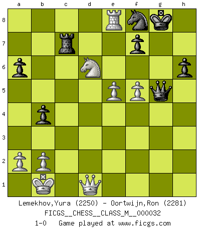 Last move : 1-0 2009 November 28 9:35:11 [Event "FICGS__CHESS__CLASS_M__000032"] [Site "FICGS"] [Date "2009.09.24"] [Round "1"] [White "Lemekhov,Yura"] [Black "Oortwijn,Ron"] [Result "1-0"] [WhiteElo "2250"] [BlackElo "2281"] 1.d4 d5 2.c4 c6 3.Nf3 Nf6 4.Nc3 e6 5.e3 Nbd7 6.Qc2 Bd6 7.g4 dxc4 8.Bxc4 Nd5 9.Bd2 b6 10.O-O-O Nxc3 11.Bxc3 b5 12.Be2 Bb7 13.Ne5 b4 14.Be1 c5 15.Nc4 Be7 16.f3 Rc8 17.dxc5 Bxc5 18.Bg3 O-O 19.Kb1 Qe7 20.Rhe1 Rfe8 21.Qd3 Nf8 22.Nd6 Rcd8 23.e4 e5 24.Nf5 Qc7 25.Qb3 Ne6 26.Bb5 Rxd1+ 27.Rxd1 Rd8 28.Rc1 g6 29.Nh6+ Kg7 30.Bc4 Bc8 31.g5 Nd4 32.Qd3 Ne6 33.Bd5 Qd6 34.Qd2 Bb7 35.Rd1 Kf8 36.Qc1 Bxd5 37.Rxd5 Qc6 38.Qc4 Qb6 39.Ng4 Bd6 40.Bf2 Qb7 41.h4 Rc8 42.Qb3 Qc6 43.Be3 a6 44.Qd1 Bc7 45.h5 gxh5 46.Nf6 Kg7 47.f4 Bb6 48.Bxb6 Qxb6 49.Qxh5 Nf8 50.f5 Qf2 51.Qd1 Qe3 52.Rxe5 Qxg5 53.Ne8+ Kg8 54.Nd6 Rc7 55.Re8 h6 56.e5 1-0 QGD Slav : 4.Nc3 Queenside Castling by player White (move 10) Kingside Castling by player Black (move 18) Player White won this chess game. Follow this game move after move (download)A bad day of Chess is better than any good day at work. (Anonymous) Wir irren allesamt, nur jeder irrt anders. (Georg Christoph Lichtenberg) Los errores estan ahí, esperando a que se cometan. (Savielly Tartakower) L'attaque fait le spectacle, la défense gagne les matchs. (Dicton footballistique) It's not enough to succeed. Others must fail. (Gore Vidal)