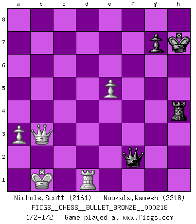 Last move : 1/2-1/2 2010 April 17 15:17:47 [Event "FICGS__CHESS__BULLET_BRONZE__000218"] [Site "FICGS"] [Date "2010.04.17"] [Round "1"] [White "Nichols,Scott"] [Black "Nookala,Kamesh"] [Result "1/2-1/2"] [WhiteElo "2161"] [BlackElo "2218"] 1.e4 c5 2.Nf3 d6 3.d4 cxd4 4.Nxd4 Nf6 5.Nc3 a6 6.Be3 e5 7.Nb3 Be6 8.f3 Be7 9.Qd2 O-O 10.O-O-O Nbd7 11.g4 b5 12.g5 b4 13.Ne2 Ne8 14.f4 a5 15.f5 a4 16.Nbd4 exd4 17.Nxd4 b3 18.Kb1 bxc2+ 19.Nxc2 Bb3 20.axb3 axb3 21.Na3 Ne5 22.h4 Ra4 23.Bd4 Nf3 24.Qc3 Nxd4 25.Rxd4 Rxd4 26.Qxd4 d5 27.Qxd5 Qb6 28.Bc4 Bxa3 29.bxa3 Nd6 30.g6 hxg6 31.fxg6 Nxc4 32.gxf7+ Rxf7 33.Qxc4 Qf2 34.Qxb3 Kh7 35.Rd1 Rf4 36.e5 Rxh4 1/2-1/2 Sicilian : Najdorf, Byrne (English) attack Kingside Castling by player Black (move 9) Queenside Castling by player White (move 10) 10 pieces endgame at move 34 : White KQRPPP , Black KQRP WHITE : King + 1 Queen 1 Rook 3 Pawns BLACK : King + 1 Queen 1 Rook 1 Pawn 9 pieces endgame at move 36 : White KQRPP , Black KQRP WHITE : King + 1 Queen 1 Rook 2 Pawns BLACK : King + 1 Queen 1 Rook 1 Pawn This chess game ended in a draw. Follow this game move after move (download)The blunders are all there on the board, waiting to be made. (Savielly Tartakover) Kombinieren und Schwarzhandel gehören verboten. (Savielly Grigorievitsch Tartakower) Una compensación adecuada por un sacrificio es tener una combinación sólida que conduce a una posición ganadora; una compensación adecuada por una metida de pata es dejar a tu oponente arrebatar una derrota de las fauces de la victoria. (Bruce A. Moon) Seul un grand joueur sait à quel point il joue faiblement. (Xavier Tartacover) Control your own destiny or someone else will. (Jack Welch)