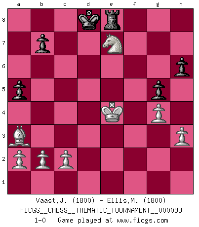 Last move : 1-0 2009 October 17 19:44:37 [Event "FICGS__CHESS__THEMATIC_TOURNAMENT__000093"] [Site "FICGS"] [Date "2009.09.26"] [Round "1"] [White "Vaast,Jean-Philippe"] [Black "Ellis,Maurice"] [Result "1-0"] [WhiteElo "1800"] [BlackElo "1800"] 1.d4 f5 2.e4 fxe4 3.Nc3 Nf6 4.g4 h6 5.f3 d5 6.h3 e6 7.Bg2 c5 8.fxe4 cxd4 9.Qxd4 Nc6 10.Qa4 Bb4 11.Bd2 Bd7 12.O-O-O a5 13.Nb5 Na7 14.Bxb4 Nxb5 15.Ba3 Nc3 16.Qd4 Nxd1 17.exd5 Bc6 18.Ne2 Bxd5 19.Bxd5 Qxd5 20.Rxd1 Qxd4 21.Nxd4 O-O-O 22.Nxe6 Rxd1+ 23.Kxd1 g5 24.Kd2 Ne4+ 25.Ke3 Re8 26.Ng7 Rg8 27.Nf5 Re8 28.Ne7+ Kd8 29.Kxe4 1-0 Dutch : Staunton gambit, Tartakower variation Queenside Castling by player White (move 12) Queenside Castling by player Black (move 21) Player White won this chess game. Follow this game move after move (download)I'm not a materialistic person, in that, I don't suffer the lack or loss of money. The absence of worldly goods I don't look back on. For Chess is a way I can be as materialistic as I want without having to sell my soul. (Jamie Walter Adams) Ich würde die 30 stärksten Spieler der USA im Simultanspiel besiegen. (José Raúl Capablanca) Existen dos clases de sacrificios: los correctos y los míos. (Mikhail Tal) Les échecs c'est le défi de l'alpiniste, toujours plus haut, prêt à tout pour monter à l'assaut du Roi ennemi. Les échecs, c'est de la musique en mouvement, un ballet majestueux pour les yeux. C'est de la poésie composée par les fantômes du passé qui au même titre que Rimbaud ou Verlaine méritent notre admiration. Les échecs, c'est de la peinture ou le moindre mouvement modifie le tableau pour en faire un Picasso ou un Van Gogh. Les échecs, c'est tout et rien, c'est la vie et la mort. Jjulie33 sur le forum de France-Echecs. I have opinions of my own - strong opinions - but I don't always agree with them. (George Bush)