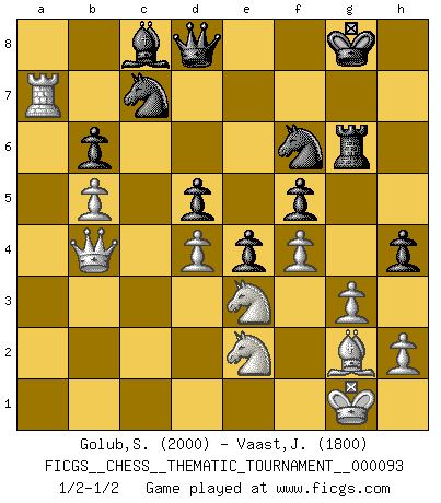 Last move : 1/2-1/2 2010 April 23 17:57:3 [Event "FICGS__CHESS__THEMATIC_TOURNAMENT__000093"] [Site "FICGS"] [Date "2009.09.26"] [Round "1"] [White "Golub,Sergey"] [Black "Vaast,Jean-Philippe"] [Result "1/2-1/2"] [WhiteElo "2000"] [BlackElo "1800"] 1.d4 f5 2.c4 e6 3.g3 Nf6 4.Bg2 Be7 5.Nd2 d6 6.Nh3 O-O 7.O-O e5 8.e3 Na6 9.a3 e4 10.f3 c6 11.Nf4 d5 12.cxd5 cxd5 13.b4 Nc7 14.Qb3 Kh8 15.b5 b6 16.a4 g5 17.Ne2 a6 18.Bb2 Bd7 19.Nc3 axb5 20.axb5 Rxa1 21.Rxa1 Bd6 22.f4 gxf4 23.exf4 h5 24.Ba3 Bxa3 25.Rxa3 h4 26.Qb4 Rg8 27.Nf1 Bc8 28.Ra7 Rg6 29.Ne2 Kg8 30.Ne3 1/2-1/2 Dutch defense Kingside Castling by player Black (move 6) Kingside Castling by player White (move 7) This chess game ended in a draw. Follow this game move after move (download)Best by test: 1. e4 (Bobby Fischer) Sie führen leise Selbstgespräche, schlürfen lautstark ihre Getränke, schmatzen hörbar beim Essen, blasen ihrem Gegenüber Rauch in die Augen, niesen ihm ins Gesicht, starren ihn unverwandt an, bis er sich unter ihren Blicken windet, rutschen ständig auf ihrem Stuhl hin und her, rülpsen und bohren in der Nase. (Anonymous) Es muy difícil jugar en contra de la teoría de Einstein. - en su primera derrota en contra de Fischer (Mikhail Tal) 'L'échange des dames est un coup dur pour les deux adversaires...' Un journaliste lors d'une partie du match Spassky-Fischer I would love to change the world, but they won't give me the source code. (Unknown)