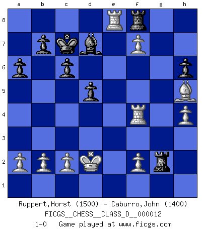 Last move : 1-0 2006 October 15 20:36:30 [Event "FICGS__CHESS__CLASS_D__000012"] [Site "FICGS"] [Date "2006.09.28"] [Round "1"] [White "Ruppert,Horst"] [Black "Caburro,John"] [Result "1-0"] [WhiteElo "1500"] [BlackElo "1400"] 1.d4 e5 2.dxe5 Nc6 3.Nf3 Qe7 4.Nc3 Nxe5 5.e4 Nxf3+ 6.Qxf3 Nf6 7.Bg5 h6 8.Bxf6 Qxf6 9.Qxf6 gxf6 10.Nd5 Kd8 11.Nxf6 Bg7 12.e5 d6 13.O-O-O Bxf6 14.exf6 Be6 15.Be2 Rg8 16.Bf3 Rb8 17.Rd4 Rg6 18.Rf4 c6 19.h4 Kc7 20.Re1 Re8 21.Kd2 Bd7 22.Bh5 Rxg2 23.Bxf7 Rf8 24.Bh5 d5 25.f7 a6 26.Re8 1-0 Queen's pawn : Charlick (Englund) gambit Queenside Castling by player White (move 13) Player White won this chess game. Follow this game move after move (download)It is not enough to be a good player... you must also play well. (Siegbert Tarrasch) Der Umstand, daß uns eine 7 Stunden Zeitkontrolle ermöglicht eine großartige, tiefe Partie zu spielen, ist für die Massenmedien nicht weiter von Bedeutung. (Alexej Shirov) Hay jugadores fuertes y personas amables y yo soy un jugador fuerte. (Bobby Fischer) Ce qui est bien, c'est d'avoir tout un tas de pièces en prise : l'adversaire ne peut en prendre qu'une à la fois. Cité par Thierry Audin. Humor is by far the most significant activity of the human brain. (Edward De Bono)