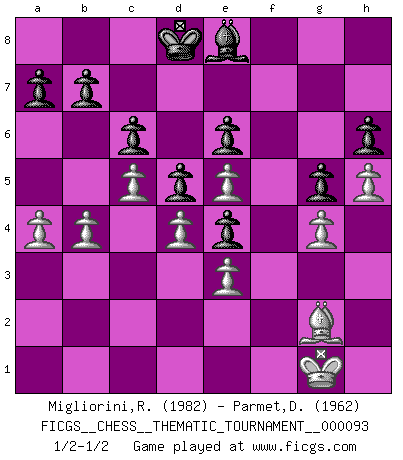 Last move : 1/2-1/2 2009 November 18 18:43:47 [Event "FICGS__CHESS__THEMATIC_TOURNAMENT__000093"] [Site "FICGS"] [Date "2009.09.26"] [Round "1"] [White "Migliorini,Roberto"] [Black "Parmet,Daniel"] [Result "1/2-1/2"] [WhiteElo "1982"] [BlackElo "1962"] 1.d4 f5 2.c4 Nf6 3.g3 e6 4.Bg2 Be7 5.Nc3 O-O 6.Nf3 Ne4 7.Qc2 d5 8.O-O c6 9.Ne5 Nd7 10.Nxe4 fxe4 11.Bf4 Bf6 12.Rad1 Bg5 13.Bxg5 Qxg5 14.f4 Qe7 15.e3 Nxe5 16.fxe5 Bd7 17.c5 Rxf1+ 18.Rxf1 Rf8 19.Rxf8+ Kxf8 20.Qf2+ Ke8 21.a4 Kd8 22.Qf4 Be8 23.b4 Bh5 24.Qf1 Qf7 25.Qxf7 Bxf7 26.g4 g5 27.h4 h6 28.h5 Be8 1/2-1/2 Dutch defense Kingside Castling by player Black (move 5) Kingside Castling by player White (move 8) This chess game ended in a draw. Follow this game move after move (download)The older I grow, the more I value pawns. (Paul Keres) Auf jeden Fall musst du zuerst Rechtsanwalt werden, damit du deine eigenen Interessen und die deiner Familie vertreten kannst. [Brief an seinen Sohn] (José Raúl Capablanca) Fischer es el jugador mas fuerte del mundo. De hecho, el jugador mas fuerte que jamas haya existido. (Larry Evans) Un millionnaire : 'Monsieur Steinitz ! Vous ne participez aux tournois que pour l'argent, alors que moi je n'y viens que pour l'honneur.' Steinitz : 'Chacun joue pour ce qu'il n'a pas'... Go and wake up your luck. (Persian saying)