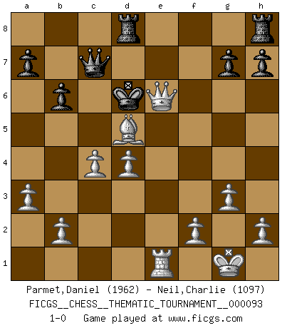 Last move : 1-0 2009 October 25 22:41:51 [Event "FICGS__CHESS__THEMATIC_TOURNAMENT__000093"] [Site "FICGS"] [Date "2009.09.26"] [Round "1"] [White "Parmet,Daniel"] [Black "Neil,Charlie"] [Result "1-0"] [WhiteElo "1962"] [BlackElo "1097"] 1.d4 f5 2.Nf3 Nf6 3.c4 b6 4.Nc3 Bb7 5.g3 e6 6.Bg2 Bb4 7.O-O Qe7 8.Nb5 Na6 9.a3 c6 10.Ng5 Bd6 11.Nxd6+ Qxd6 12.e4 fxe4 13.Bf4 Qe7 14.Nxe4 d5 15.Nd6+ Kf8 16.Re1 Rd8 17.Nxb7 Qxb7 18.Rxe6 Nc7 19.Rxf6+ Kg8 20.Rxc6 Qxc6 21.Bxc7 Qxc7 22.Bxd5+ Kf8 23.Qf3+ Ke8 24.Re1+ Kd7 25.Qf5+ Kd6 26.Qe6+ 1-0 Dutch Kingside Castling by player White (move 7) Player White won this chess game. Follow this game move after move (download)Morphy was probably the greatest genius of them all. (Bobby Fischer) Schach verlangt totale Konzentration. (Robert James Fischer) Tu sabes que vas a perder. Aún cuando tenía la ventaja, yo sabía que iba a perder. - al estar jugando con Fischer (Andrew Soltis) Je menace de comprendre la position. (Anonyme) Perhaps chess is the wrong game for the times (The Chess Master and the Computer, by Garry Kasparov - 2010)