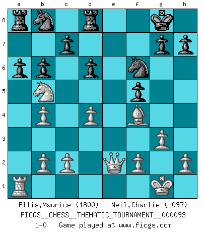 Last move : 1-0 2009 October 5 18:39:28 [Event "FICGS__CHESS__THEMATIC_TOURNAMENT__000093"] [Site "FICGS"] [Date "2009.09.26"] [Round "1"] [White "Ellis,Maurice"] [Black "Neil,Charlie"] [Result "1-0"] [WhiteElo "1800"] [BlackElo "1097"] 1.d4 f5 2.Nc3 Nf6 3.Nf3 e6 4.g3 b6 5.Bg2 Bb7 6.O-O Bb4 7.Bf4 O-O 8.Nb5 d6 9.a3 a6 10.Ng5 Bxg2 11.Nxe6 Bxf1 12.Nxd8 Bxe2 13.Qxe2 Rxd8 14.axb4 1-0 Dutch Kingside Castling by player White (move 6) Kingside Castling by player Black (move 7) Player White won this chess game. Follow this game move after move (download)A Chess game is divided into three stages: the first, when you hope you have the advantage, the second when you believe you have an advantage, and the third... when you know you're going to lose ! (Savielly Tartakower) Mit Schach schule ich mein Gefühl für Geometrie, was für Tennis und Schach gleichermaßen wichtig ist. (Boris Becker) Los libros de Ajedrez deben de usarse igual como usamos los anteojos: para mejorar la vista, aunque algunos jugadores los quieren usar como si ellos les otorgaran la vision. (José Raúl Capablanca) La guerre est enfant de la passion, la passion est enfant du narcissisme et le narcissisme est l'enfant. (...) Une autre partie ? (Thibault de Vassal) Industry executives and analysts often mistakenly talk about strategy as if it were some kind of chess match. But in chess, you have just two opponents, each with identical resources, and with luck playing a minimal role. The real world is much more like a poker game, with multiple players trying to make the best of whatever hand fortune has dealt them. In our industry, Bill Gates owns the table until someone proves otherwise. (David Moschella, 'Computerworld')