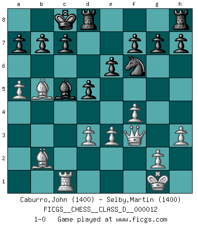 Last move : 1-0 2006 December 3 4:45:31 [Event "FICGS__CHESS__CLASS_D__000012"] [Site "FICGS"] [Date "2006.09.28"] [Round "1"] [White "Caburro,John"] [Black "Selby,Martin"] [Result "1-0"] [WhiteElo "1400"] [BlackElo "1400"] 1.f4 Nf6 2.b3 Nc6 3.Bb2 d5 4.Nf3 Ng4 5.h3 Nf6 6.e3 Bf5 7.Bb5 Be4 8.d3 Bxf3 9.Qxf3 e6 10.O-O Qd7 11.Nd2 O-O-O 12.a4 Qd6 13.a5 Qb4 14.Bxc6 Qxd2 15.Bb5 Qxc2 16.Bd4 Qxb3 17.Rfb1 Qc2 18.Rb2 Qxb2 19.Bxb2 Bc5 20.Rc1 1-0 Bird's Opening Kingside Castling by player White (move 10) Queenside Castling by player Black (move 11) Player White won this chess game. Follow this game move after move (download)Methodical thinking is of more use in Chess than inspiration. (C. J. S. Purdy) Schon mancher Spieler hat aufgegeben, um zu vermeiden, daß er eine Figur verliert. (Savielly Grigorievitsch Tartakower) En el Ajedrez, tal como en la vida, las bendiciones de hoy pueden ser el veneno del mañana. (Assaic) 'L'échange des dames est un coup dur pour les deux adversaires...' Un journaliste lors d'une partie du match Spassky-Fischer Follow your passion, and success will follow you. (Arthur Buddhold)