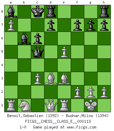 Last move : 1-0 2009 October 14 18:10:55 [Event "FICGS__CHESS__CLASS_E__000113"] [Site "FICGS"] [Date "2009.09.29"] [Round "1"] [White "Benoit,Sebastien"] [Black "Budnar,Milos"] [Result "1-0"] [WhiteElo "1392"] [BlackElo "1394"] 1.e4 e5 2.Nf3 Nc6 3.Bb5 a6 4.Ba4 Nf6 5.d4 b5 6.Bb3 Nxd4 7.Nxd4 exd4 8.e5 Ne4 9.Bd5 c6 10.Bxe4 Bc5 11.O-O Qe7 12.Bd3 Bb7 13.Re1 O-O-O 14.a4 Bb4 15.c3 dxc3 16.bxc3 Ba5 17.axb5 Bb6 18.bxa6 Ba8 19.a7 Qc5 20.Be3 1-0 Ruy Lopez : Morphy defense Kingside Castling by player White (move 11) Queenside Castling by player Black (move 13) Player White won this chess game. Follow this game move after move (download)Good positions don't win games, good moves do. (Gerald Abrahams) Kein Großmeister ist normal. Sie unterscheiden sich nur im Ausmaß Ihrer Verrücktheit. (Viktor Kortschnoi) La táctica fluye a partir de una posición superior. (Bobby Fischer) Toute estimation doit être constamment réévaluée. (Jacob Estrin) Tree pose grows confidence. It roots me to this world. (Terri Guillemets)