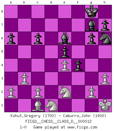 Last move : 1-0 2007 May 15 21:15:49 [Event "FICGS__CHESS__CLASS_D__000012"] [Site "FICGS"] [Date "2006.09.28"] [Round "1"] [White "Kohut,Gregory"] [Black "Caburro,John"] [Result "1-0"] [WhiteElo "1700"] [BlackElo "1400"] 1.e4 g6 2.d4 Bg7 3.Nc3 d6 4.f4 c5 5.Nf3 cxd4 6.Nxd4 Nc6 7.Bb5 Bd7 8.Be3 a6 9.Bxc6 bxc6 10.O-O Nf6 11.Qd3 O-O 12.Rad1 Ng4 13.Bc1 Qb6 14.Kh1 e5 15.fxe5 dxe5 16.Nde2 Be6 17.Qf3 Rad8 18.Rxd8 Rxd8 19.h3 Nh6 20.b3 f5 21.Bg5 Rf8 22.Qe3 Qxe3 23.Bxe3 f4 24.Bc1 Rd8 25.Rd1 Rxd1+ 26.Nxd1 1-0 Robatsch defense : Pseudo-Austrian attack Kingside Castling by player White (move 10) Kingside Castling by player Black (move 11) Player White won this chess game. Follow this game move after move (download)A man without frontiers. He didn't divide the East and the West, he brought them together in their admiration for him. (Ljubomir Ljubojevic, about Bobby Fischer's death) Ja, ich habe einmal eine Blitzpartie gespielt, es war in einem Zug, 1929. --im Interview 1989 (Mikhail Moiseyevich Botvinik) El Ajedrez moderno está demasiado preocupado con cosas como la estructura de Peones. Olvidenlo, el Jaque Mate termina la partida. (Nigel Short) Les échecs, c'est l'art d'analyser. (Mikhail Botvinnik) They say in chess you've got to kill the queen, and then you mate it... Oh I, do you ? (Red Hot Chili Peppers, Fortune faded)