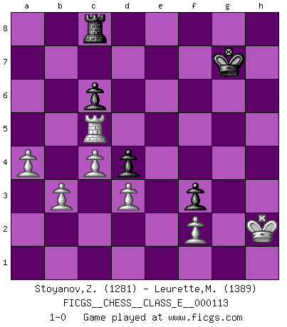 Last move : 1-0 2009 October 9 17:46:42 [Event "FICGS__CHESS__CLASS_E__000113"] [Site "FICGS"] [Date "2009.09.29"] [Round "1"] [White "Stoyanov,Zdravko"] [Black "Leurette,Marc-Antoine"] [Result "1-0"] [WhiteElo "1281"] [BlackElo "1389"] 1.e4 e5 2.Nf3 Nc6 3.Bb5 Nf6 4.h3 Nxe4 5.Bxc6 bxc6 6.d3 Nf6 7.Qe2 d6 8.O-O Be7 9.Bg5 Rb8 10.Nbd2 O-O 11.Bxf6 Bxf6 12.Rab1 c5 13.b3 c6 14.c4 Qe7 15.Rfe1 a5 16.Ne4 d5 17.Nxf6+ Qxf6 18.Qxe5 Bf5 19.Qxf6 gxf6 20.Rbd1 d4 21.Nh4 Bg6 22.Re7 Kg7 23.Nxg6 hxg6 24.Rde1 g5 25.Rc7 Rbc8 26.R1e7 f5 27.Rxc8 Rxc8 28.Ra7 g4 29.hxg4 fxg4 30.Rxa5 f5 31.Rxc5 f4 32.a4 f3 33.gxf3 gxf3 34.Kh2 1-0 Ruy Lopez : Berlin defense Kingside Castling by player White (move 8) Kingside Castling by player Black (move 10) Player White won this chess game. Follow this game move after move (download)My style is somewhere between that of Tal and Petrosian. (Reshevsky) Es ist besser die Steine des Gegners zu opfern. (Savielly Grigorievitsch Tartakower) Dejen al perfeccionista jugar por correo. (Yasser Seirawan) La victoire dans une partie d'Echecs appartient la plupart du temps à celui qui voit un peu plus loin que l'adversaire. (Lasker) For a mechanic, you seem to do an excessive amount of thinking. (C-3PO in Star Wars ep.2)